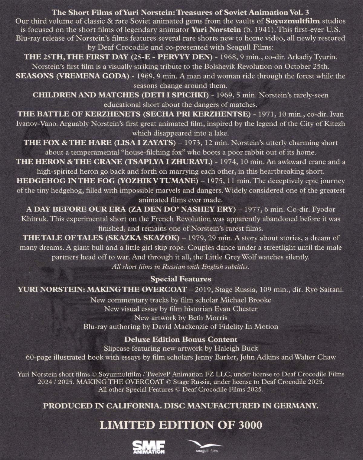 Die Blu-ray "Treasures of Soviet Animation Vol. 3 Limited Edition" enthält die folgenden Filme von Yuri Norstein: