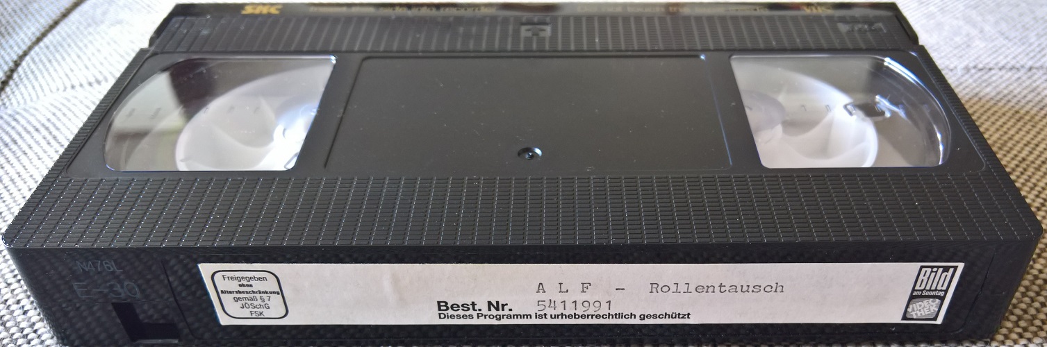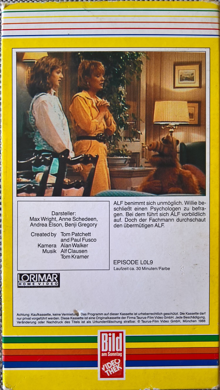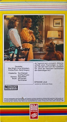 Von der Serie "ALF" sind 1988 15 Folgen aus Staffel 1 auf VHS erschienen. Das Label ist hier Bild am Sonntag/Lorimar. Alle VHS kommen im kleinen Pappschuber. Vor der Folge kommen die FSK-Freigabe, ein BamS-Einspieler und ein Rechtehinweis. Die Folgen sind uncut.Im Besitz von 0 Benutzern.