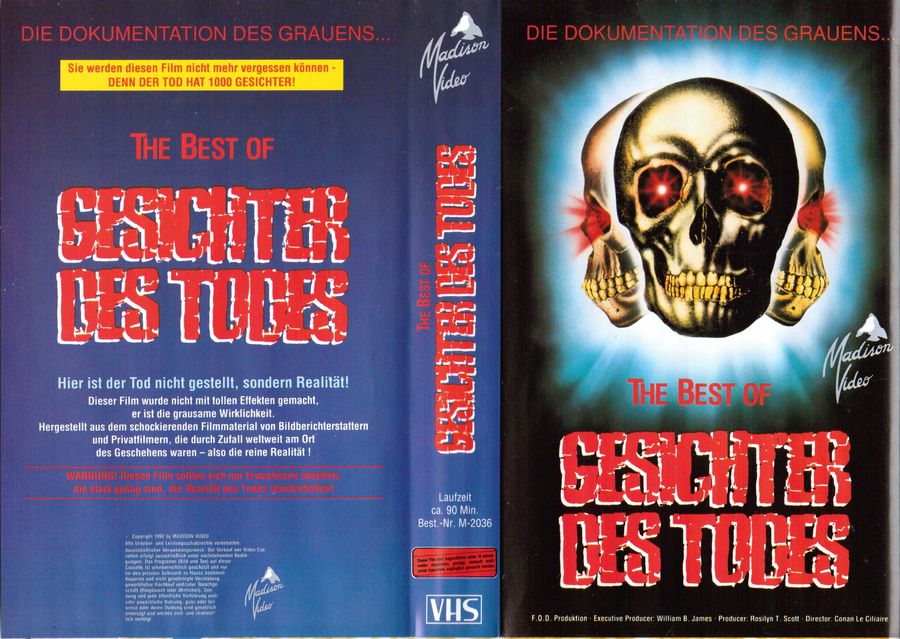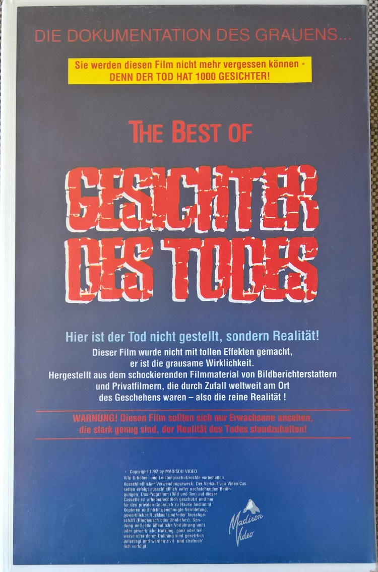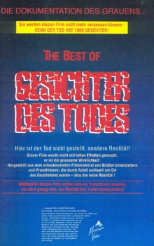 Im Jahre 1992 hat Madison Video eine Art Zusammenschnitt aus diversen Szenen der ersten drei Teile der "Gesichter des Todes"-Reihe heraus gebracht. Der Titel ist hier "The Best of Gesichter des Todes". Im Vorspann wird dann auch explizit auf Teil 1-3 hingewiesen.Im Besitz von 18 Benutzern.