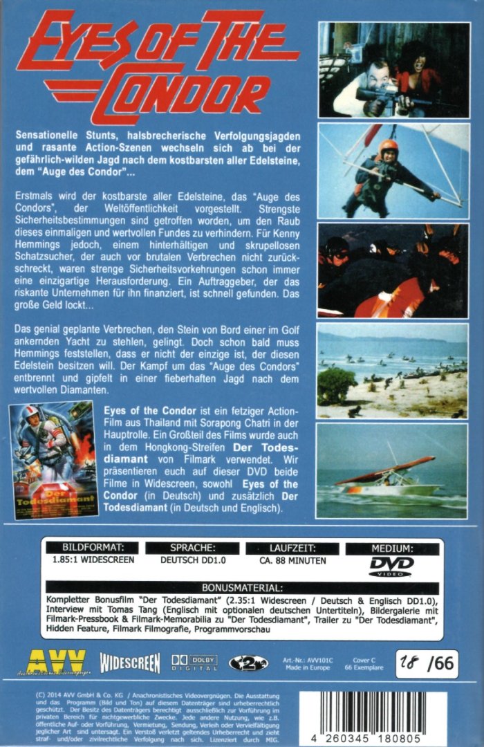 | Bonusfilm "Der Todesdiamant" (86:26 Min.) "Battle for the Treasure"-Trailer (2:50 Min.) "Battle for the Treasure"-Review (2:01 Min.) "Eyes of the Condor" - erweiterte Szene (1:00 Min.) Interview mit Tomas Tang (7:38 Min.) Covergalerie (1:01 Min.) Filmark Memorabilia (1:00 Min.) Filmark Filmographie (2:01 Min.) Trailershow: -American Force Ninja (2:27 Min.) -Blood Killer (1:56 Min.) -Ninja Force (3:23 Min.) -Ninja Challenge (2:38 Min.) -Golden Ninja Warrior (2:58 Min.) |