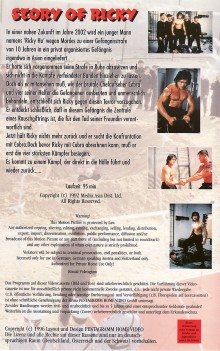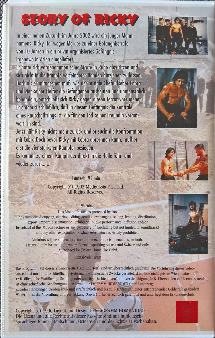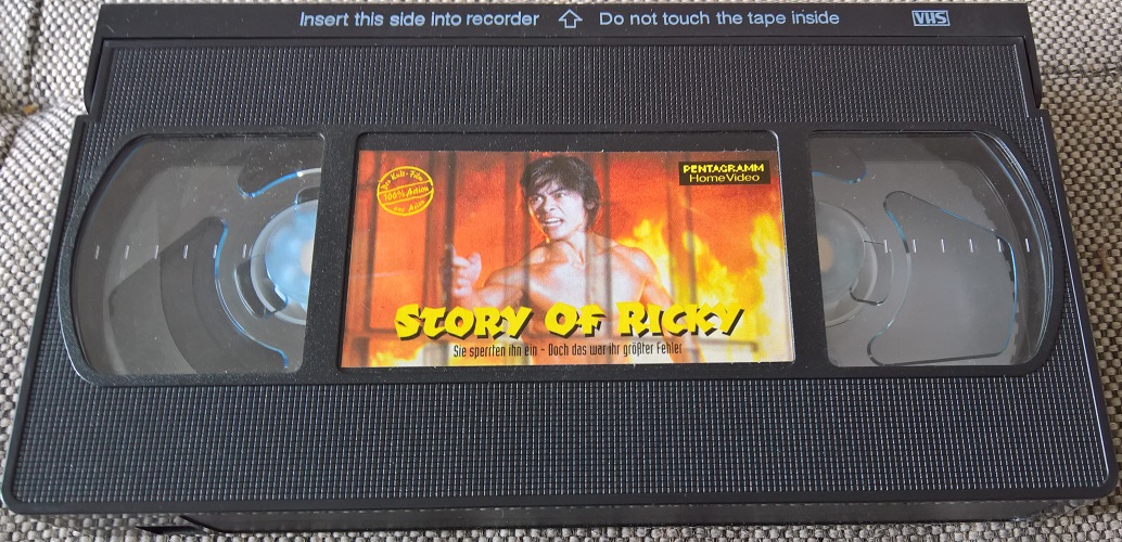 "Story of Ricky" ist 1996 von Pentagramm auf VHS erschienen. Die Auflage kommt im großen Einleger und ist uncut. Auf der Kassette ist nur der Film. Es gibt keine Logos oder Trailer. Das Bildformat ist 1,33:1 und damit falsch, aber es ist nicht gemattet. Die Auflage von New East, die später erschienen ist, ist gekürzt. Falsche Coverlaufzeit von 95 Minuten.Im Besitz von 26 Benutzern.