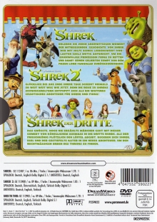 | - 2 Trailer (Beim Start der DVD) (4:04 Min.) * Bee Movie (1:36 Min.) * Kung Fu Panda (2:28 Min.) - Jahrbuch der Worcestershire Akademie - 3 Verlorene Szenen (18:25 Min.) * Der Fauxly Gral (9:23 Min.) * Heißes Mittagessen (4:37 Min.) * Cyrano de Artie (4:25 Min.) - Triff die Schauspieler (10:41 Min.) - Shreks Leitfaden zur Erziehung (2:11 Min.) * Esel (0:32 Min.) * Gestiefelter Kater (0:32 Min.) * Pinocchio (0:34 Min.) * Pfeffy (0:33 Min.) - Die Technik hinter Shrek (9:55 Min.) - Dreamworks Animation Video Jukebox (9:52 Min.) * Shrek (1:15 Min.) * Shrek 2 (1:22 Min.) * Shark Tale (2:25 Min.) * Madagascar (1:00 Min.) * Over the Hedge (1:54 Min.) * Flushed Away (1:56 Min.) - Vorschau (6:32 Min.) * Ab durch die Hecke (1:56 Min.) * Nickeloden DVDs (2:12 Min.) * Schweinchen Wilbur und seine Freunde (2:24 Min.) - DVD-Rom Shrektivitäten * Shrek Shamsh Ups * Königliche Ritterspiele * Druckvorlagen und vieles mehr! - DreamWorks Kids * Merlins magische Kristallkugel * DVD-Rom Shrektivitäten - "Shrek"-Trailer (4:17 Min.) * Shrek (2:01 Min.) * Shrek 2 (2:16 Min.) |