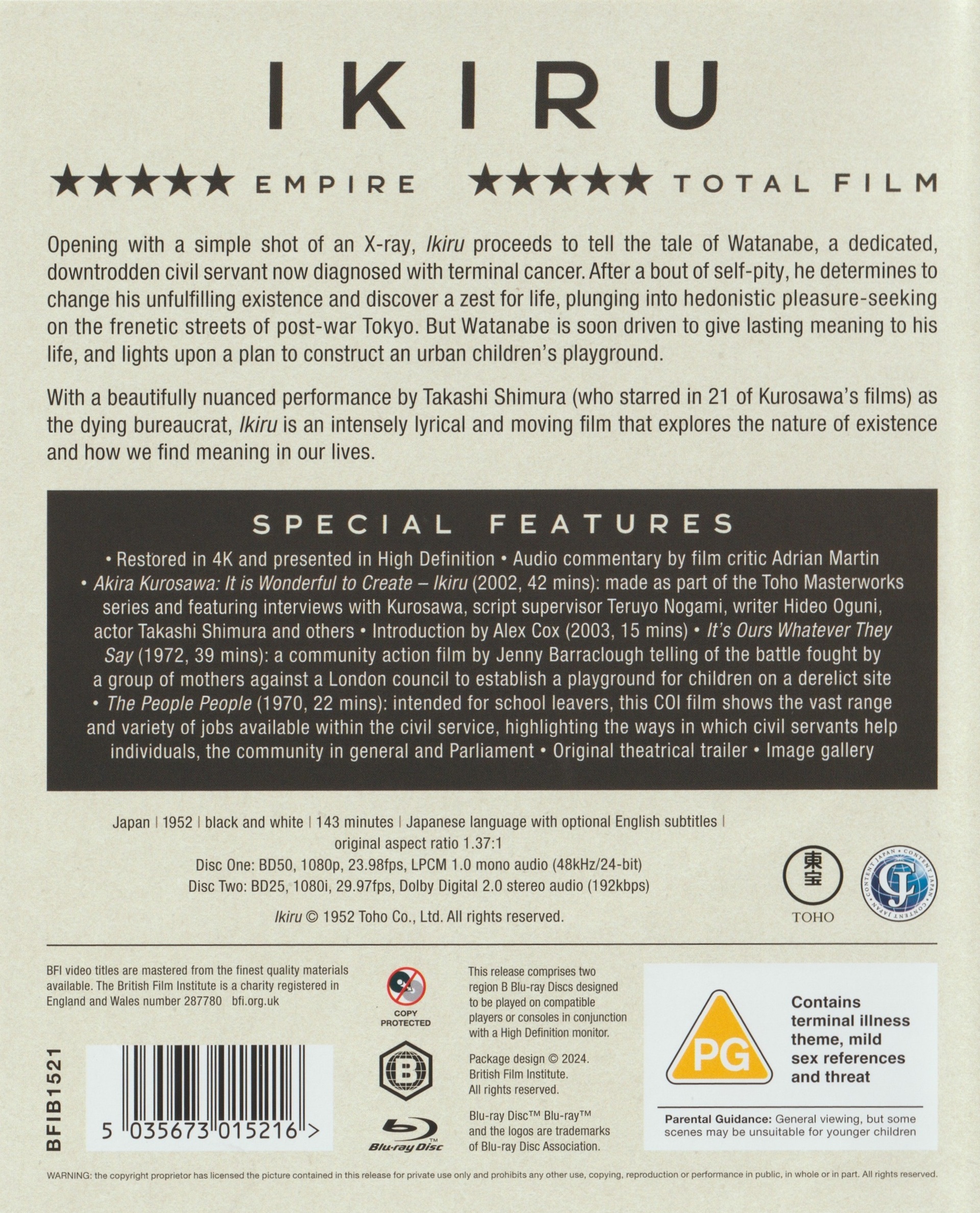 Akira Kurosawa: It is Wonderful to Create - Ikiru: made as part of the Toho Masterworks series and featuring interviews with Kurosawa, script supervisor Teruyo Nogami, writer Hideo Oguni, actor Takashi Shimura and others (41:37 Min.) - Japanisch mit optionalen englischen Untertiteln