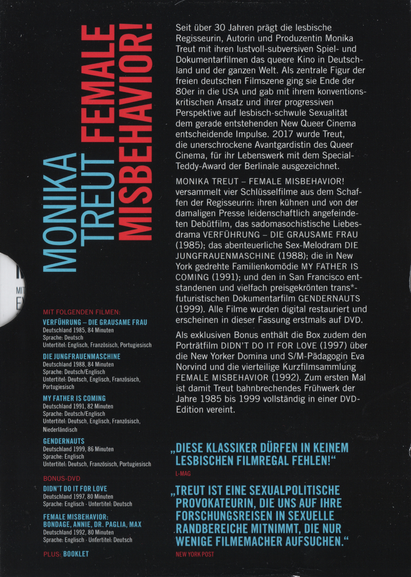 Erschienen in der Monika Treut-Box Female Misbehavior! mit insgesamt 9 Filmen auf 5 DVDs in jeweils einem Amaray Keep Case.