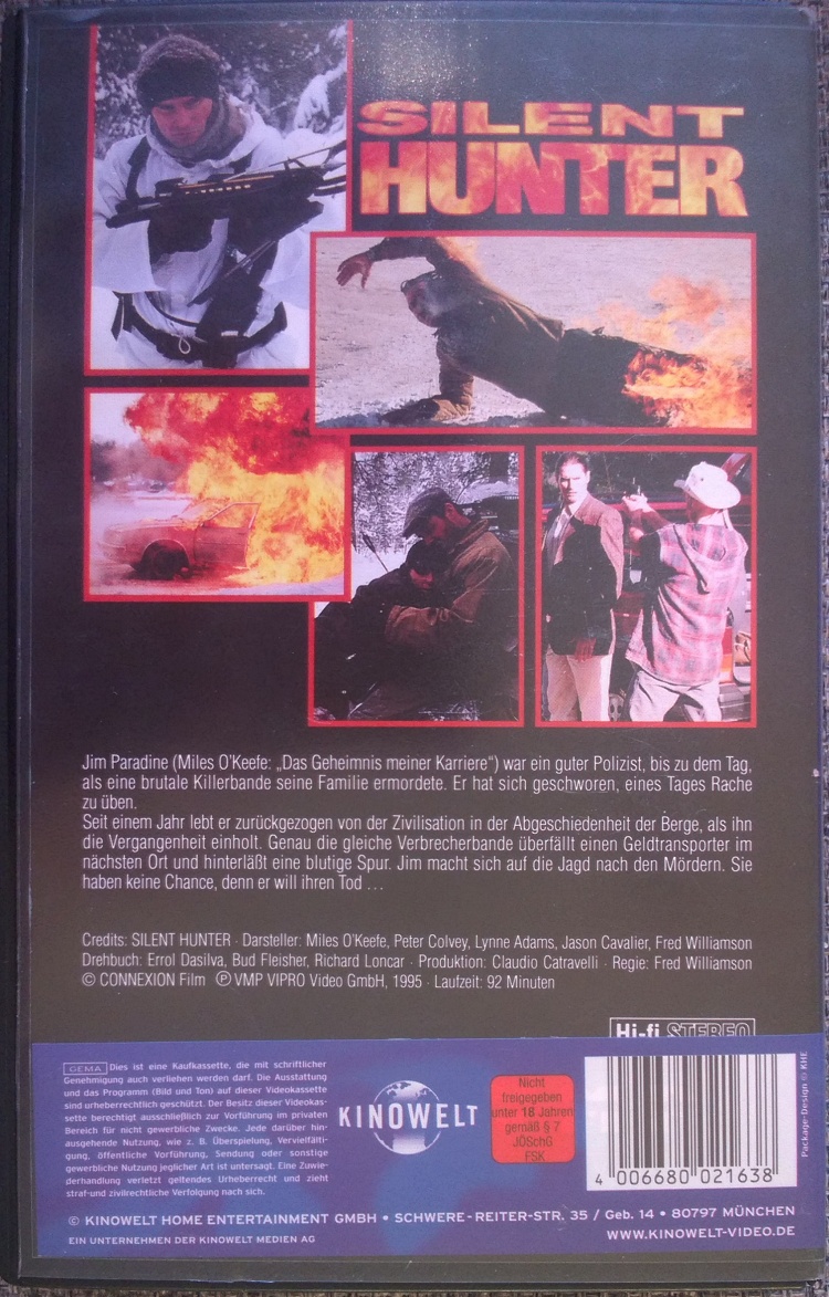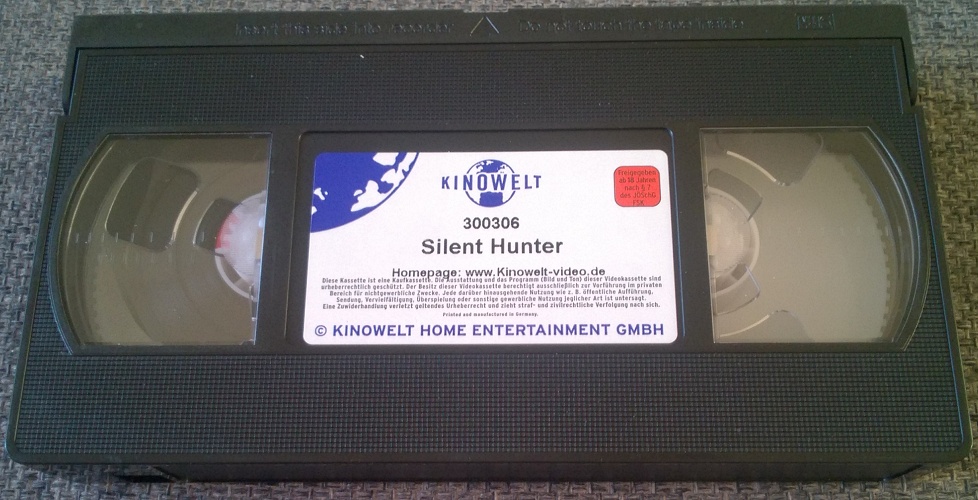 "Silent Hunter" ist 2000 von Kinowelt erschienen. Die Auflage ist uncut und kommt im großen Einleger. Kinowelt hat hier einfach das Cover von VMP genommen und einen Aufkleber über die VMP-Daten gemacht. Die Kassette ist von Kinowelt und enthält keine Trailer.Im Besitz von 0 Benutzern.
