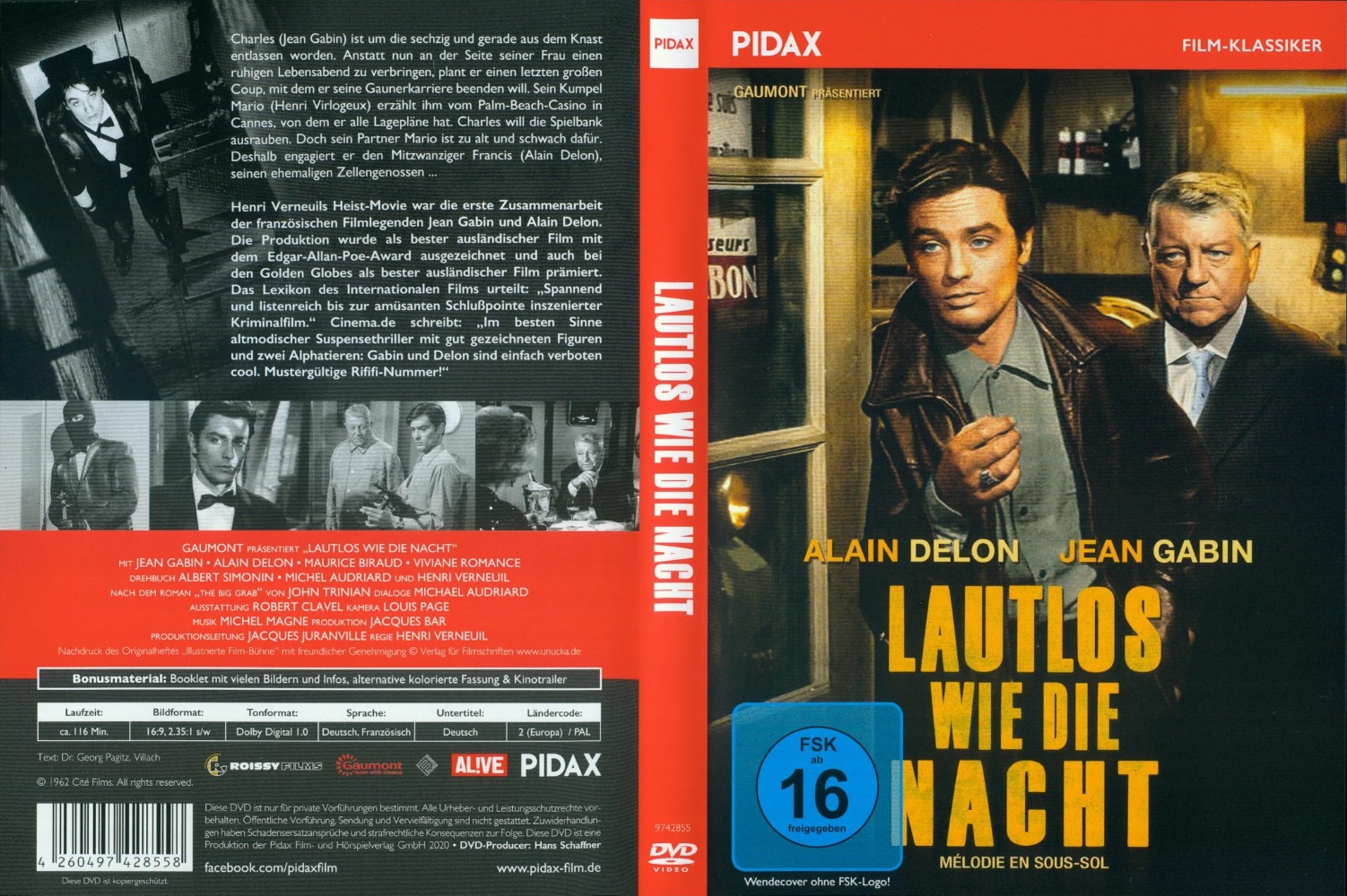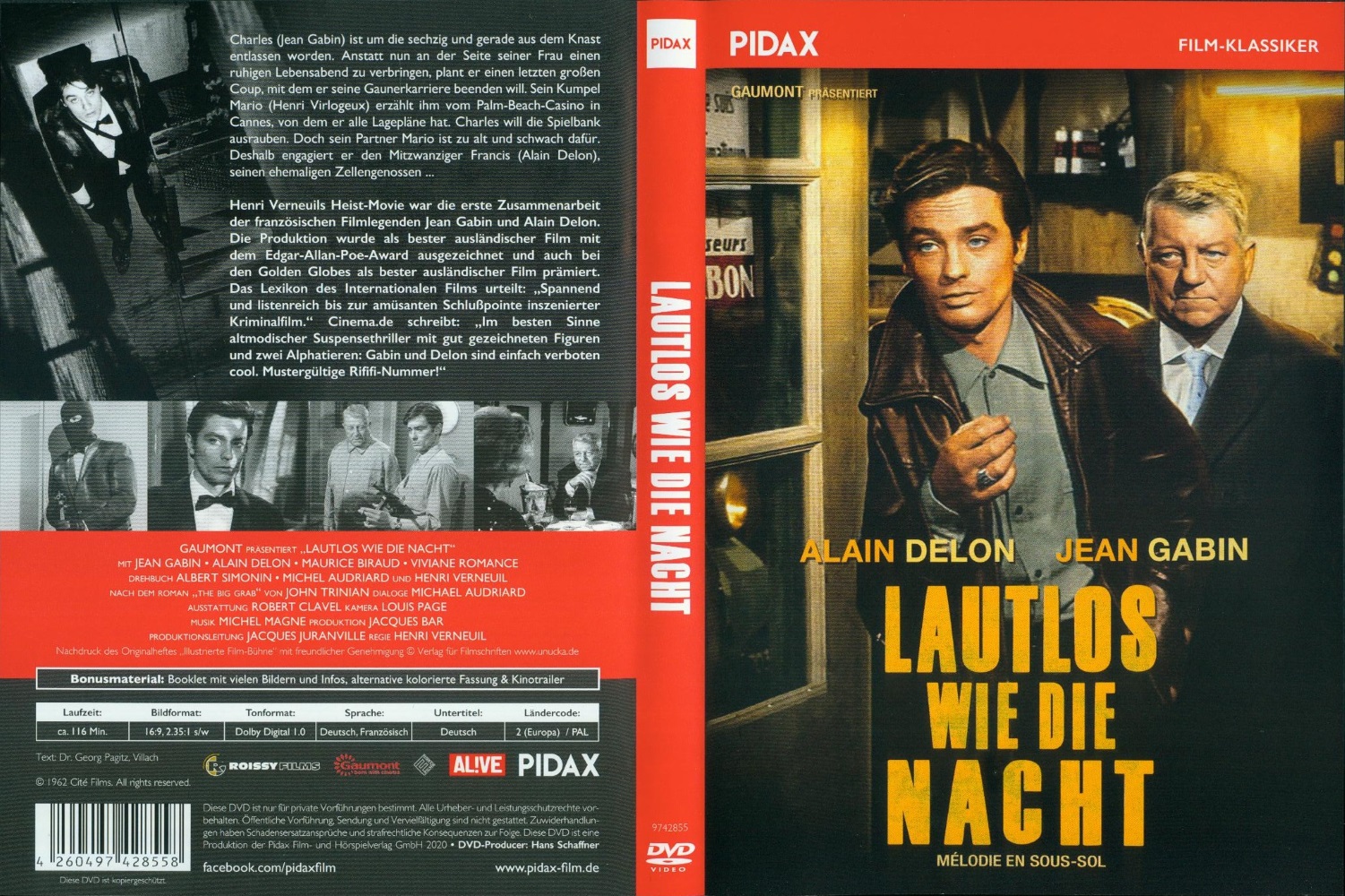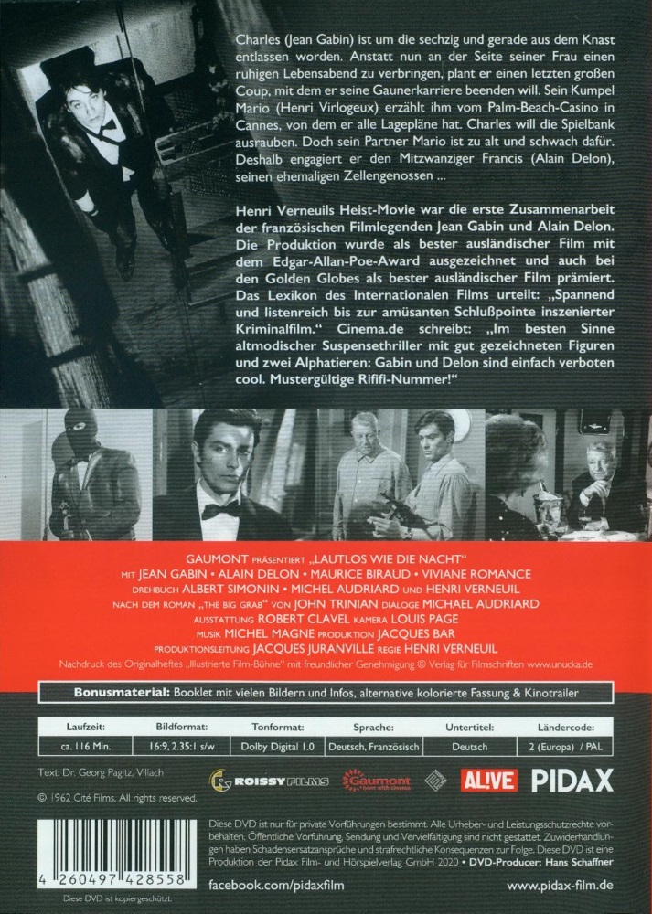 Henri Verneuils Heist-Film "Lautlos wie die Nacht" mit Jean Gabin und Alain Delon in zwei Schnittfassungen: der Originalfassung in schwarzweiß (116 Min.) und der für den amerikanischen Markt gekürzten Fassung in Farbe (103 Min.).