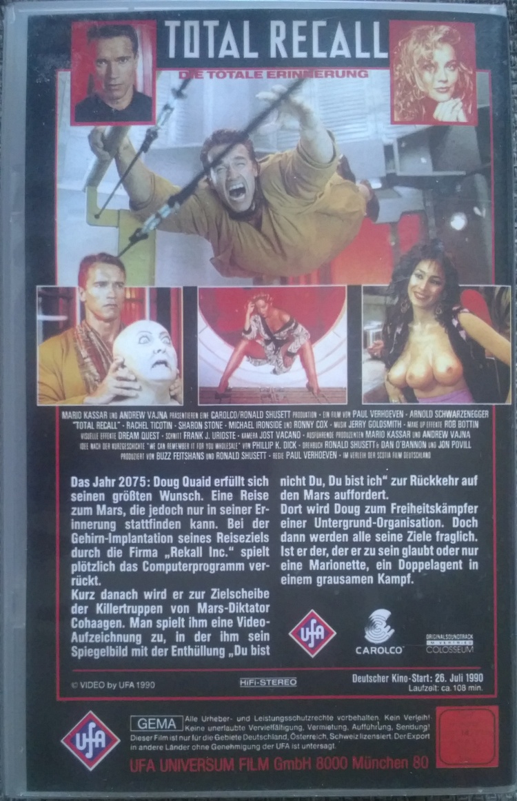 "Total Recall" ist 1998 uncut neu erschienen. Die Auflage kommt im kleinen Einleger in durchsichtiger Box. Innen ist keine Werbung aufgedruckt. Auf der Kassette ist nur der Film mit Altershinweis und UFA-Logo. Keine Trailer, keine EAN.Im Besitz von 0 Benutzern.