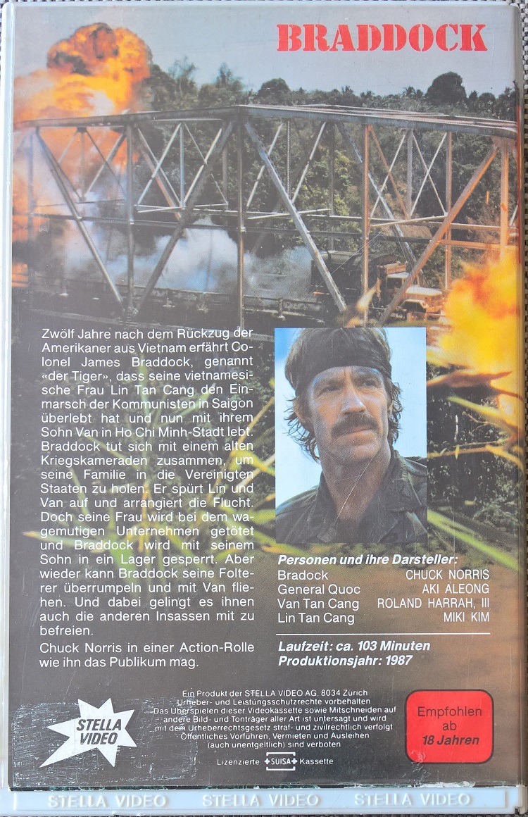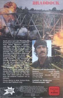 "Braddock - Missing in Action III" ist von Stella Video uncut in der Schweiz erschienen. Die Auflage kommt im großen Einleger und mit original geprägter Stella-Box. "Empfohlen ab 18 Jahren" steht hinten drauf. Zählt für Deutschland natürlich als ungeprüft. Die Kassette hat zwei Aufkleber und eine weiße Klappe.Im Besitz von 0 Benutzern.