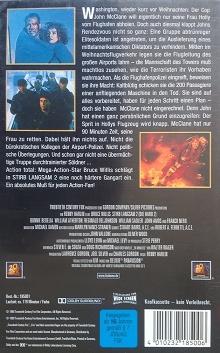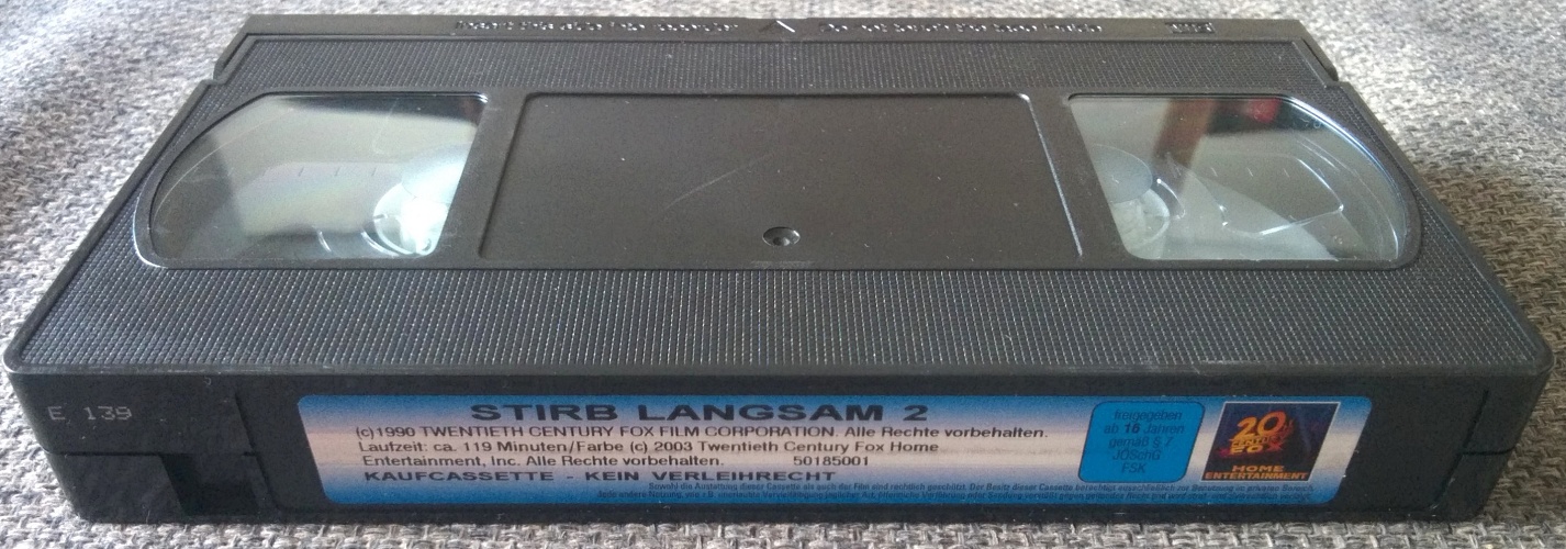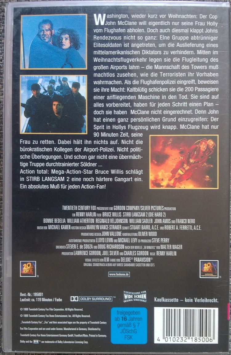 "Stirb langsam 2" ist auch 2003 noch mal leicht gekürzt auf VHS erschienen. Es ist ein kleiner Einleger mit Werbung im Inneren für andere Filme. Auf dem Einleger steht 1999 und auf der Kassette explizit 2003 als Erscheinungsjahr.Im Besitz von 0 Benutzern.