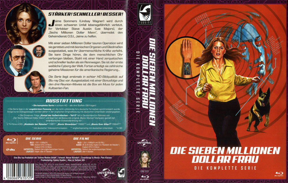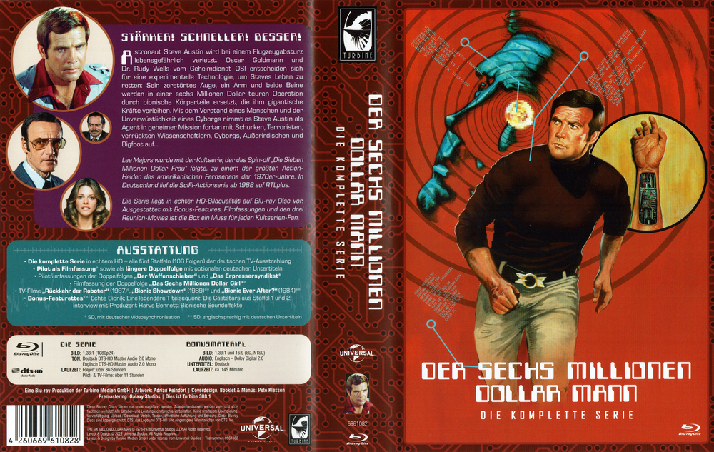 Bei der Bionic Box handelt es sich um eine Komplettbox mit den beiden vollständgien Serien "Der sechs Millionen Dollar Mann" und "Die sieben Millionen Dollar Frau" in echtem HD auf insgesamt 21 Scheiben. Jede Serie befindet sich in je einer dicken Scanavo-Box (12 Discs beim "Millionen Dollar Mann", 9 Discs bei "Millionen Dollar Frau"). Die Boxen verfügen über ein FSK-freies Cover mit einer Episodenliste als Innendruck. Beide Scanavos stecken in einem stabilen Pappschuber, der die FSK-Freigabe aufgeklebt hat. Die Veröffentlichung ist beim Turbine Medien Onlineshop exklusiv zu haben und auf 1.000 Exemplare limitiert. Jedoch werden Limitierungsnummer und -anzahl nirgendwo angegeben.
