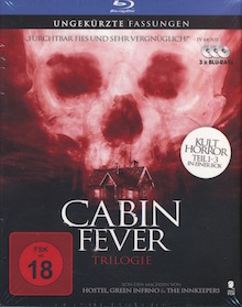 "Cabin Fever"-Trilogie mit allen drei Filmen, einzeln verpackt in Amarays (mit Wendecovern) in einem großen Pappschuber ohne ablösbares FSK-Siegel.Im Besitz von 42 Benutzern.