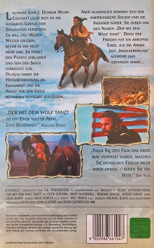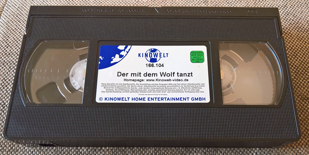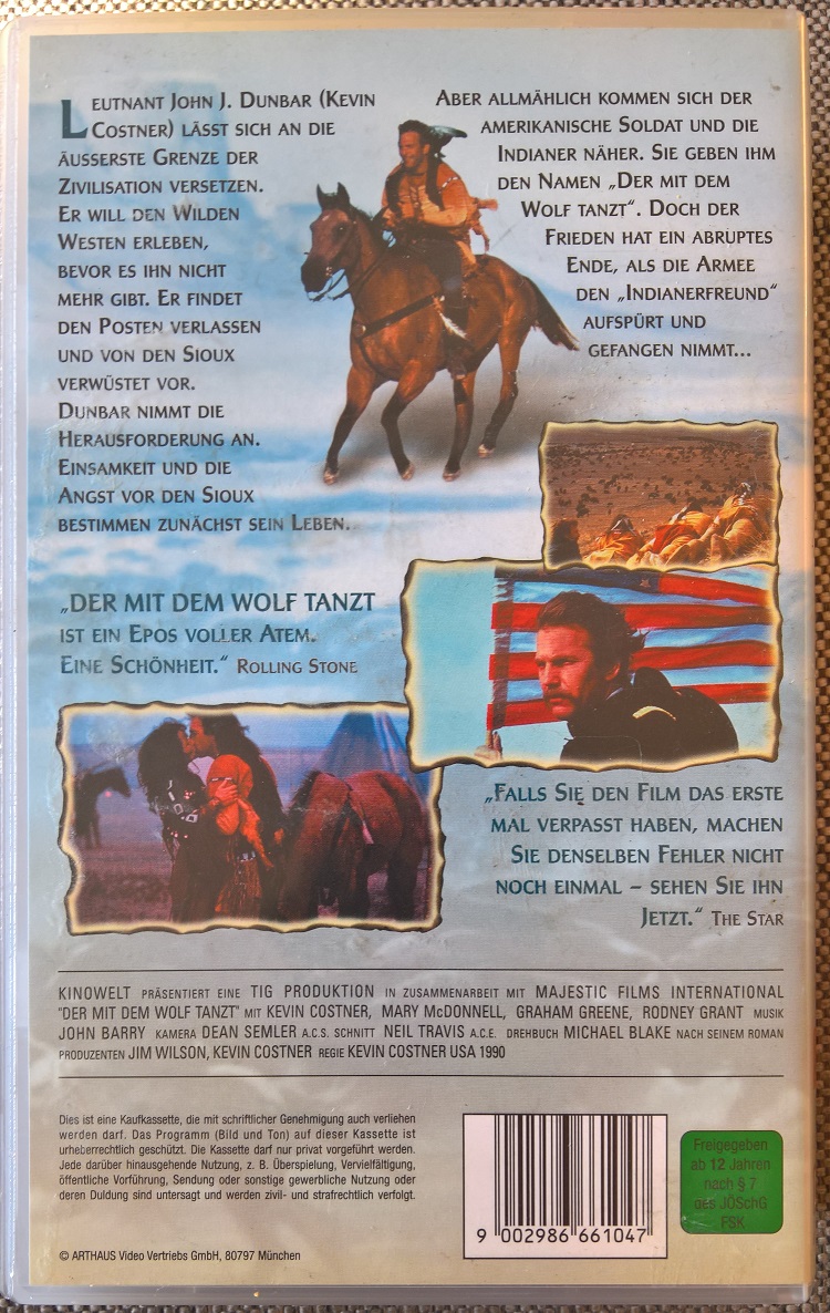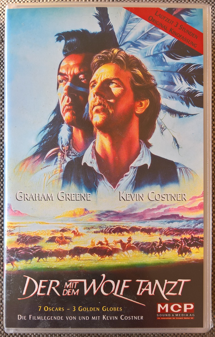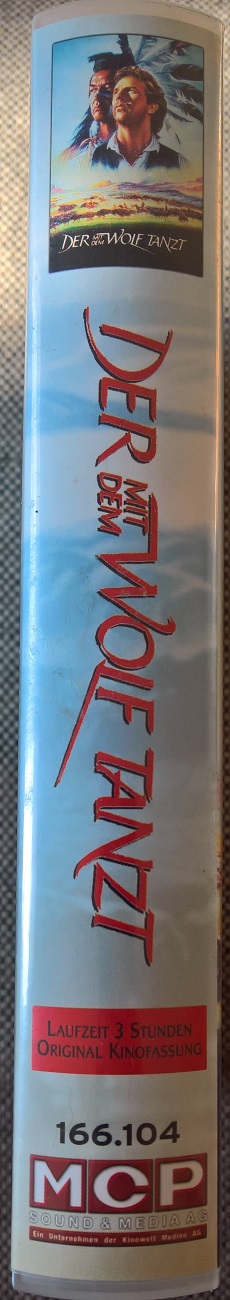 "Der mit dem Wolf tanzt" ist 2001 bei MCP in der Kinofassung erschienen. Es ist ein kleiner Einleger und eine Auflage für den Verkauf. Vor dem Film kommt nur das Kinowelt Logo und der FSK Hinweis, keine Trailer. Der Aufkleber auf der Kassette ist von Kinowelt.Im Besitz von 0 Benutzern.