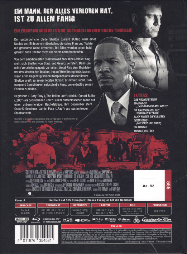 Limitiertes und nummeriertes (Format: xxx-555) Mediabook, welches den Film auf UHD und BD enthält. Auf der Rückseite sind die FSK-Freigabe sowie technische Daten und eine Inhaltsangabe aufgedruckt. Die Limitierungsnummer ist ein kleiner Papieraufkleber im entsprechenden Feld.