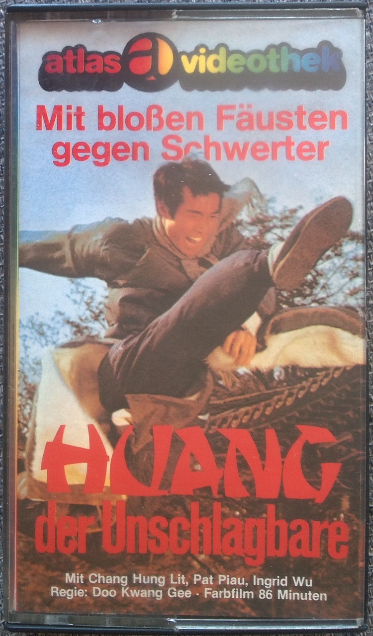 "Huang der Unschlagbare" ist Anfang der 80er Jahre von Atlas in der Glas-Klappbox erschienen. Der Film ist gekürzt. Vor dem Film kommt das Atlas Logo, keine Trailer. Der Vorspann ist in deutscher Sprache mit dem Titel: "Huang der Unschlagbare - und wenn du 100 Schwerter hast, ich werde dich töten -".Im Besitz von 9 Benutzern.