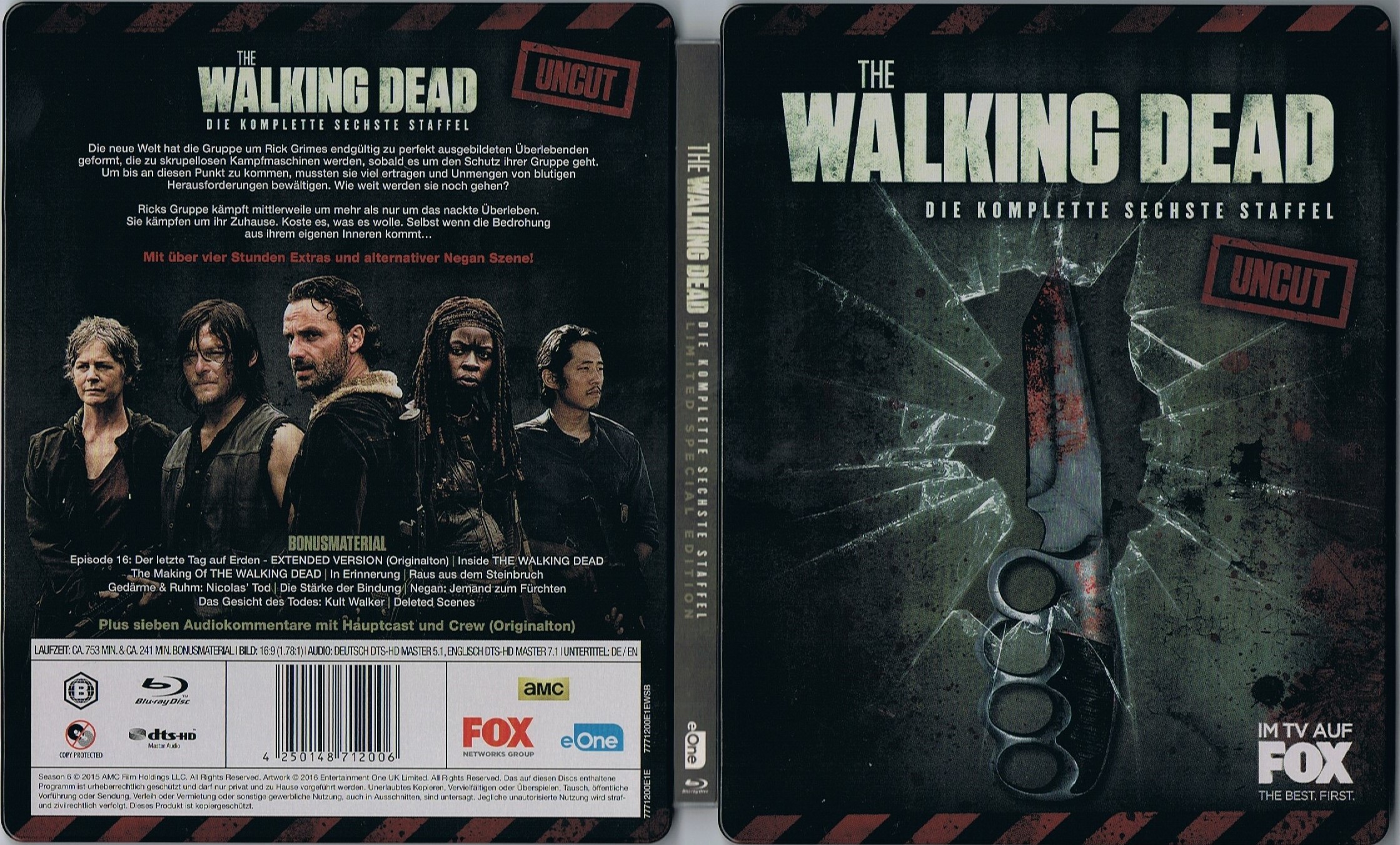 Das Making-of "The Walking Dead" (54:53 Min.) In Erinnerung (10:03 Min.) Raus aus dem Steinbruch (7:45 Min.) Gedärme und Ruhm: Nicolas Tod (5:01 Min.) Die Stärke der Bindung (11:06 Min.) Negan: Jemand zum Fürchten (5:16 Min.) Das Gesicht des Todes: Kult Walker (3:38 Min.) Alle Extras, soweit nicht anders angegeben, in HD, auf Englisch und mit optionalen deutschen UT |