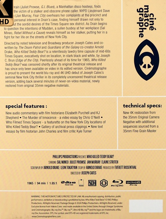 Peerlessly ahead of its time for 1965, WHO KILLED TEDDY BEAR? was censored shortly after its original theatrical release and has since only been available on video in its edited version. Cinématographe is proud to present the world blu-ray and 4K UHD debut of Joseph Cates’s seminal New York City thriller in its completely uncensored theatrical release version, adding back several minutes of never-on-video material, newly restored from original 35mm negative materials.