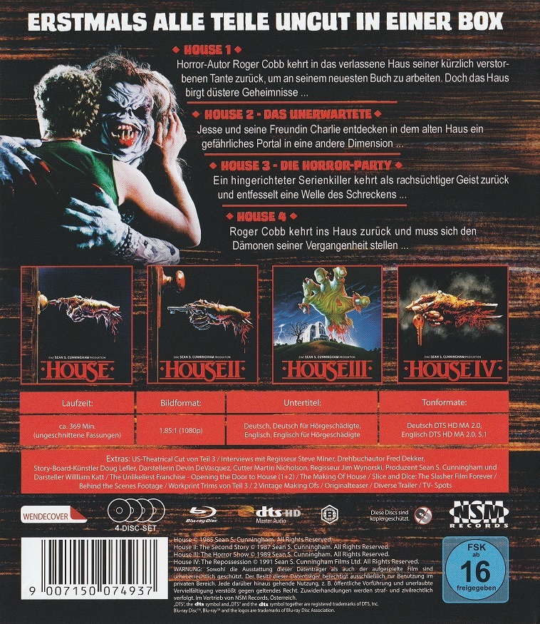 Das extra breite Amaray Keep Case beinhaltet die Filme: House, House 2 - Das Unerwartete..., Horror House - House III und House IV auf je einer Blu-ray Disc.Im Besitz von 33 Benutzern.