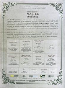 Die "Master of Suspense"-Box von Arthaus / Kinowelt deckt mit Champagne, Erpressung, Mord - Sir John greift ein, dessen deutscher Version Mary, Endlich sind wir reich, Der Auslandskorrespondent, Verdacht und Sklavin des Herzens einen weiteren Teil von Hitchcocks Lebenswerk ab. Die acht Filme wurden auf sechs DVDs verteilt und gemeinsam in ein Digipack mit drei Plastiktrays gepackt (je zwei DVDs pro Tray). Die Halterungen liegen wie z.B. auch bei der "Rambo"-Tinbox nicht in der Lochmitte der DVD, sondern an den Rändern.Im Besitz von 47 Benutzern.