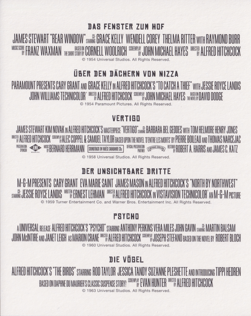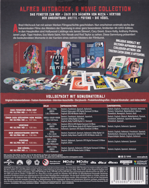 Die Box enthält sechs Filme auf UHD. Sie entsprechen den bischerigen Veröffentlichungen auf UHD. Verpackt im Digipak (innen umlaufend und aussen mit zusäztlichen Infos bedruckt), welches in einem stabilen Pappschuber steckt.