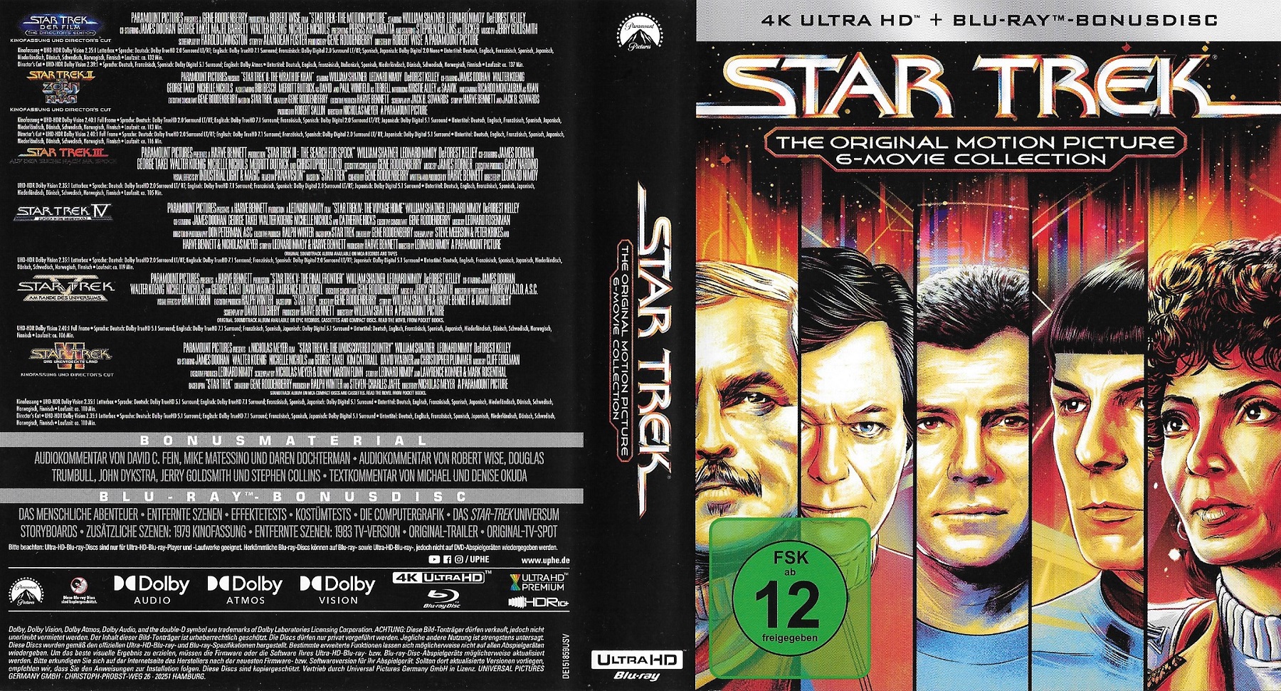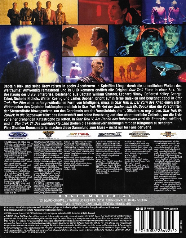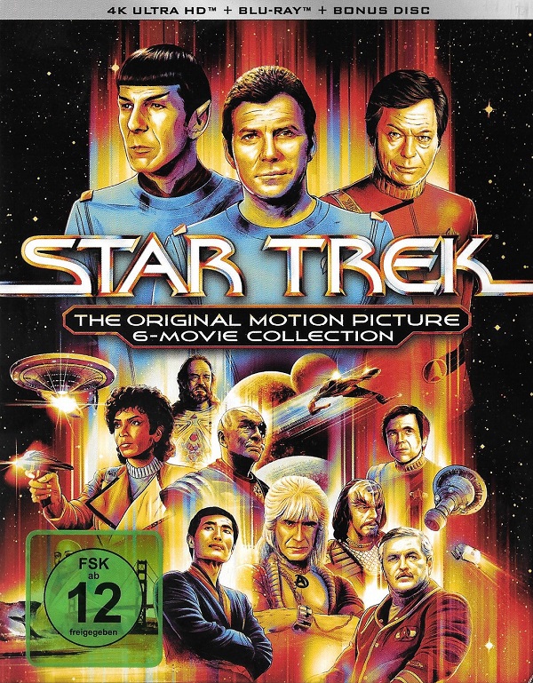"The Original Motion Picture 6-Movie Collection" mit den ersten sechs Filmen der Filmreihe über die Originalcrew der Enterprise enthält insgesamt 15 Discs. Auf Teil 1 "Star Trek - Der Film" entfallen allein 5 Discs. The Director's Edition sowie die Kinofassung liegen jeweils auf Ultra HD Blu-ray und Blu-ray vor. Zudem gibt es eine Bonus Disc (Blu-ray) zum Film. Die übrigen Filme der Reihe sind jeweils auf Ultra HD Blu-ray und Blu-ray enthalten. Die Discs zu Teil 2 "Star Trek II - Der Zorn des Khan" enhalten jeweils den Director's Cut und die Kinofassung des Films. Teil 6 "Star Trek IV - Das Unentdeckte Land" liegt als Director's Cut und Kinofassung auf Ultra HD Blu-ray vor, die Blu-ray enhält dagegen nur die Kinofassung.