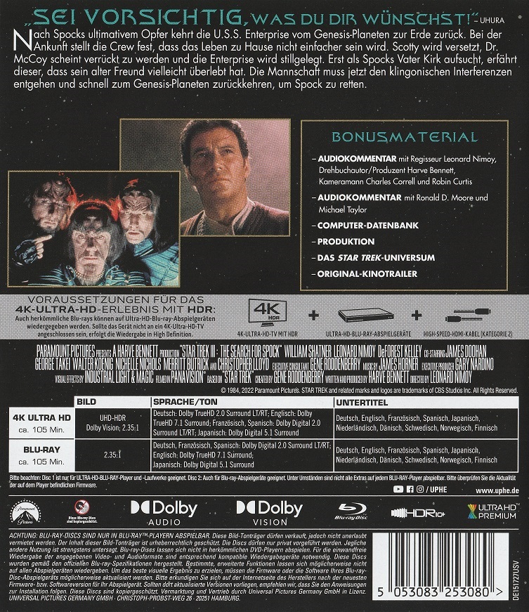 Audiolommentar mit Regisseur Leonard Nimoy, Drehbuchautor/Produzent Harve Bennet, Kameramann Charles Correll und Robin Curtis