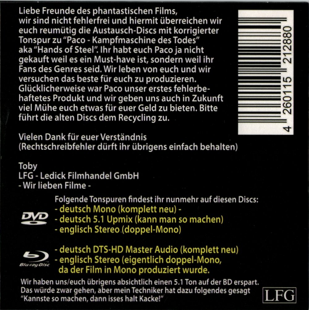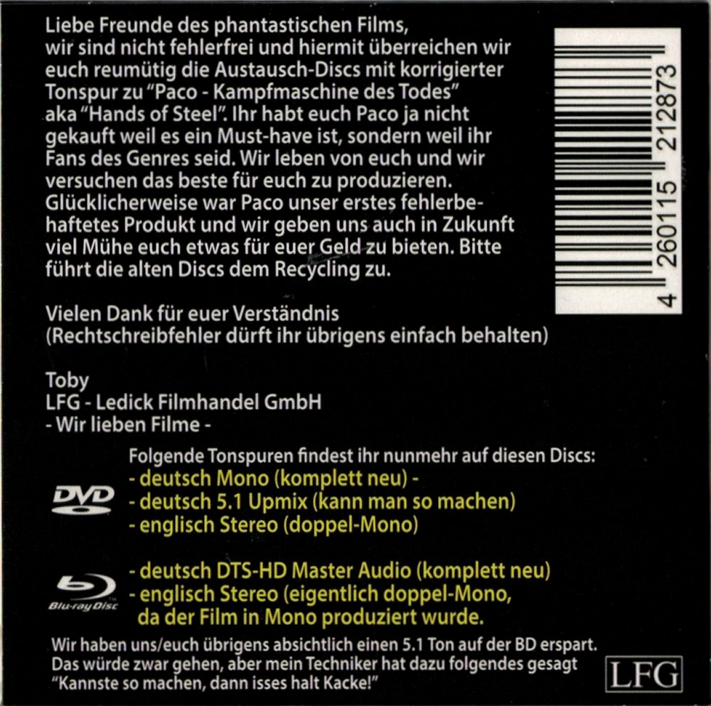 Die Tonspuren beider Discs waren fehlerhaft. Es gibt einen Austausch, welcher bereits von statten ging. Näheres dazu unter https://de-de.facebook.com/Ledick.GmbH/ Die Austausch-Discs beinhalten folgende Tonspuren: DVD