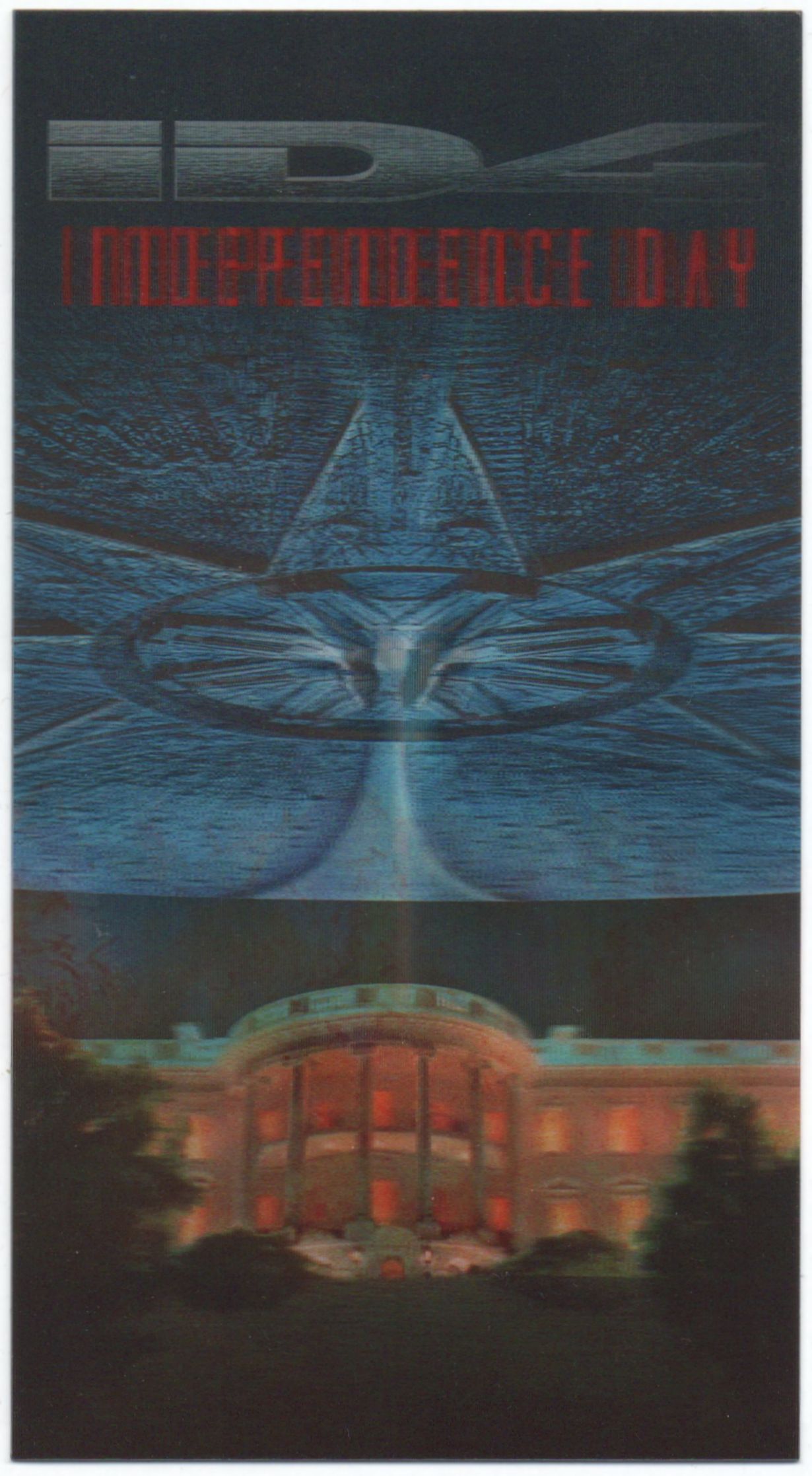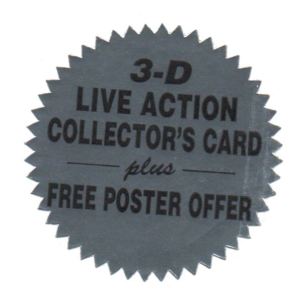 Auf der Folie befindet sich ein silberfarbener Sticker ("3-D LIVE ACTION COLLECTORS CARD plus FREE POSTER OFFER").