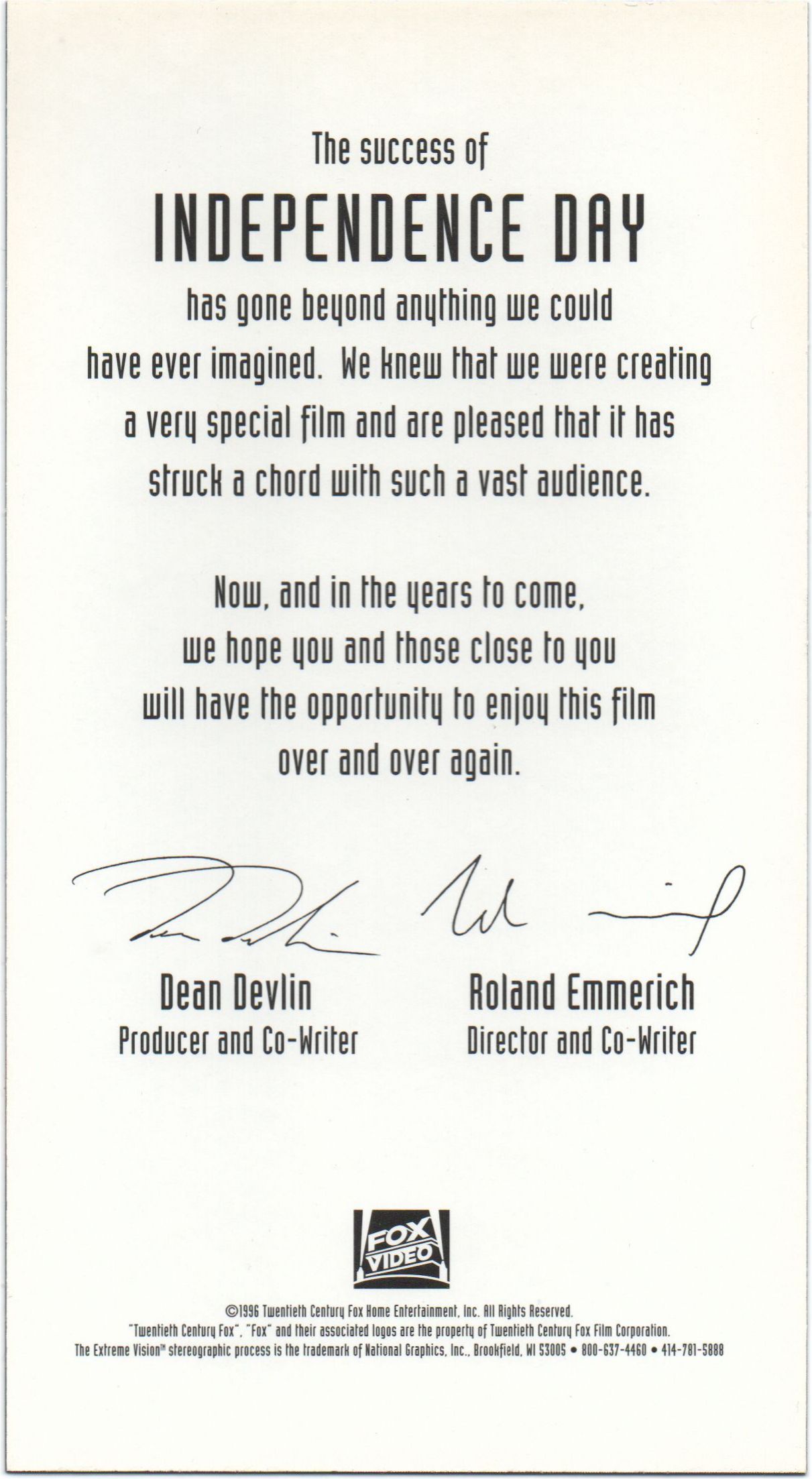 Lentikular 3D Karte mit Danksagung des Produzenten und des Regisseurs auf der Rückseite