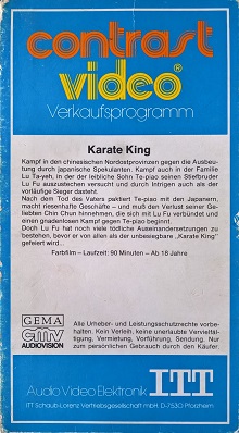 "Karate King" ist Anfang der 80er Jahre von ITT im Pappschuber als Erstauflage auf VHS erschienen. Der Film ist gekürzt. Vor dem Film kommt ein ITT-Einspieler. Es gibt keine Trailer. Der Vorspann ist in Deutsch und hat auch den deutschen Titel.Im Besitz von 1 Benutzern.