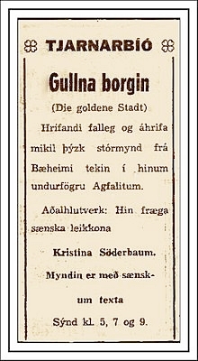 Nach Kriegsende wurden diverse deutscher Filme ins Programm genommen, die während der Besatzungszeit nicht gezeigt werden konnten. Im Tjarnarbíó lief beispielsweise ab dem 26. November 1949, also kurz nachdem Die goldene Stadt präsentiert worden war, der Tobis-Film Robert Koch aus dem Jahre 1939 und gleich darauf im Dezember Das Bad auf der Tenne von 1943, während Die goldene Stadt ab dem 29. November im nächsten Kino (Baejarbio) und landesweit noch bis hinein in die zweite Hälfte der 50er-Jahre in den isländischen Filmtheatern gezeigt wurde - mal mit schwedischen, mal mit dänischen Untertiteln.