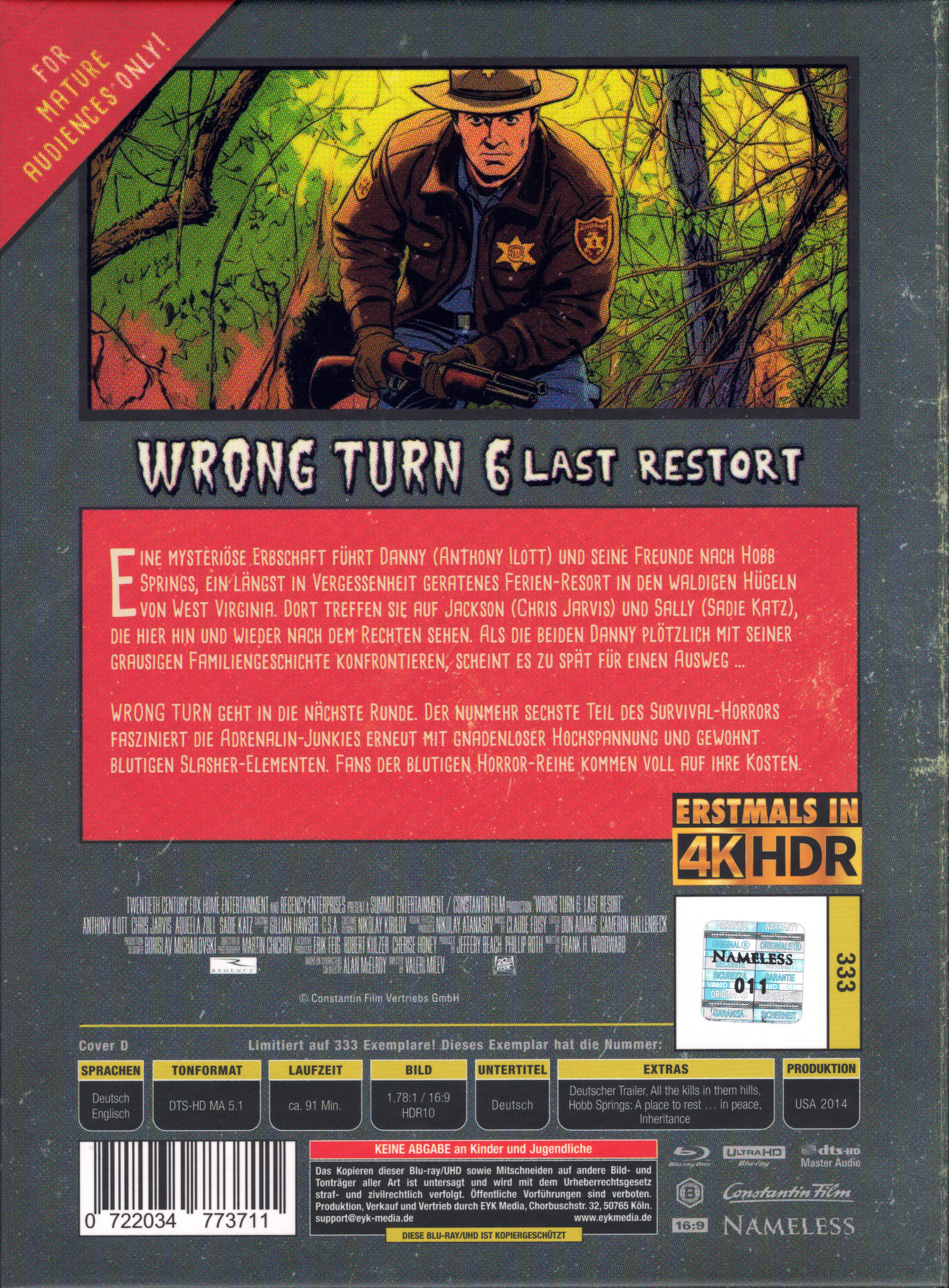 Auf 333 Exemplare limitiertes und per Hologrammsticker durchnummeriertes Mediabook mit dem Covermotiv D (Art Edition #6), welches den Film auf UHD und Blu-ray enthält. Diese Veröffentlichung ist ungeprüft und weist einen entsprechenden Aufdruck auf der Rückseite auf (Keine Abgabe an Kinder und Jugendliche). Die EAN, technische Daten und die Inhaltsangabe sind ebenfalls aufgedruckt.
