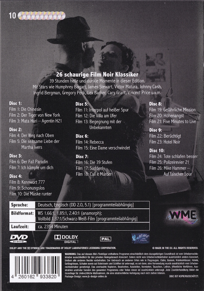 26 Filme auf 10 DVDs im breiten Keep Case (H 18,9 cm x B 13,6 cm x T 4,0 cm) mit je einem Einsteckplatz auf jeder Innenseite und 5 doppelseitigen Flügeln mit Platz für jeweils 2 DVDs (zwei Steckplätze in der Box sind somit unbelegt).