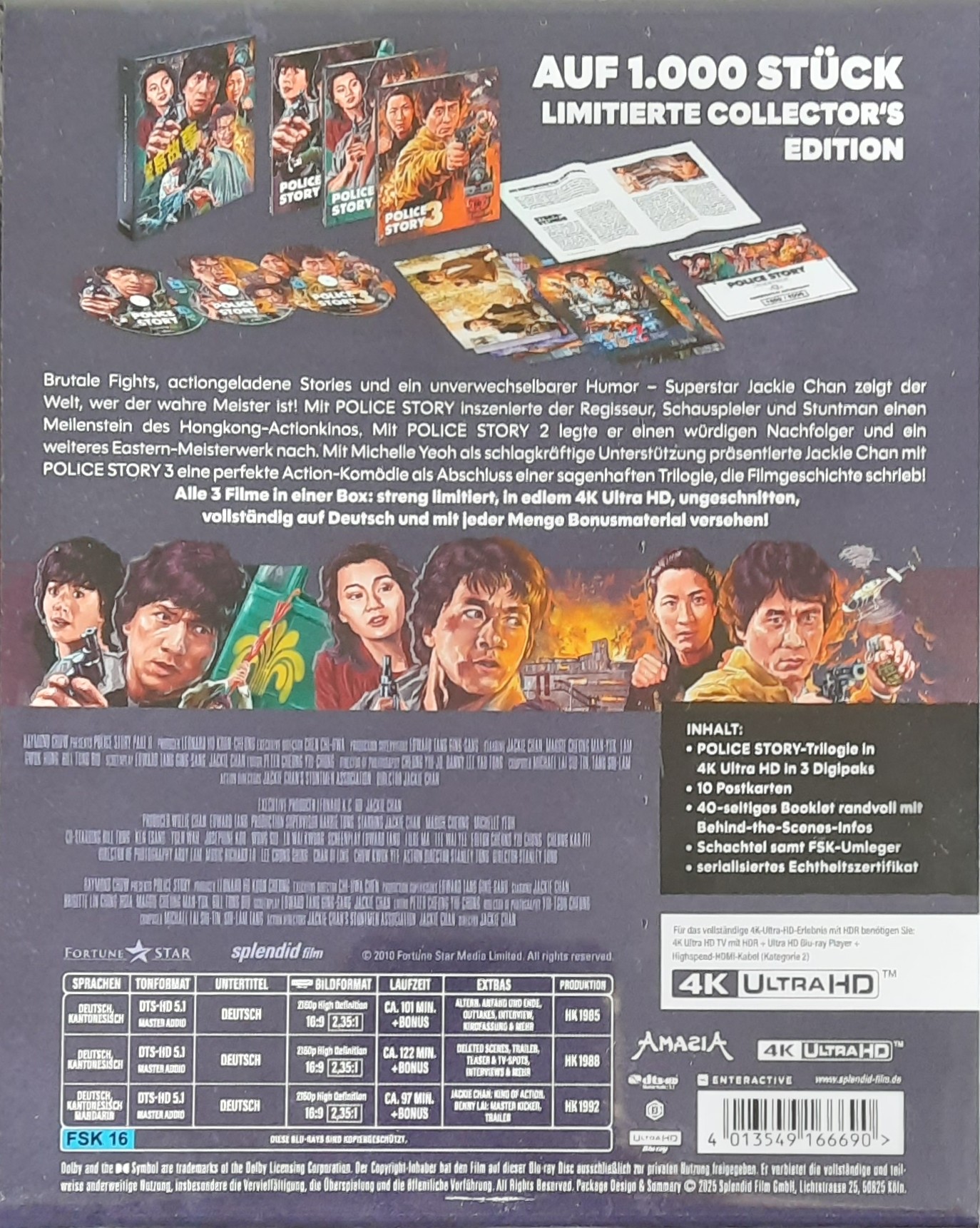 Die Police-Story-Trilogie erschien in einer auf 1.000 Stück limitierten Auflage im Digipak. Diese beinhaltet die Filme ausschließlich auf UHD in einzelnen Slim-Digi-Cases. Weiterhin ist folgendes enthalten: