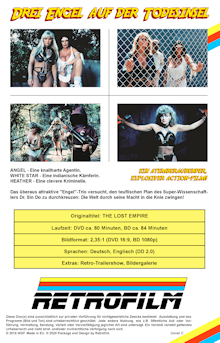 | Extras: | - Retro-Trailershow [13:59 Min.] (Fünf Trailer in einer Laufzeit gemappt) - Bildergalerie [3:10 Min.] (jede fünfte Sekunde ein anderes Bild) |