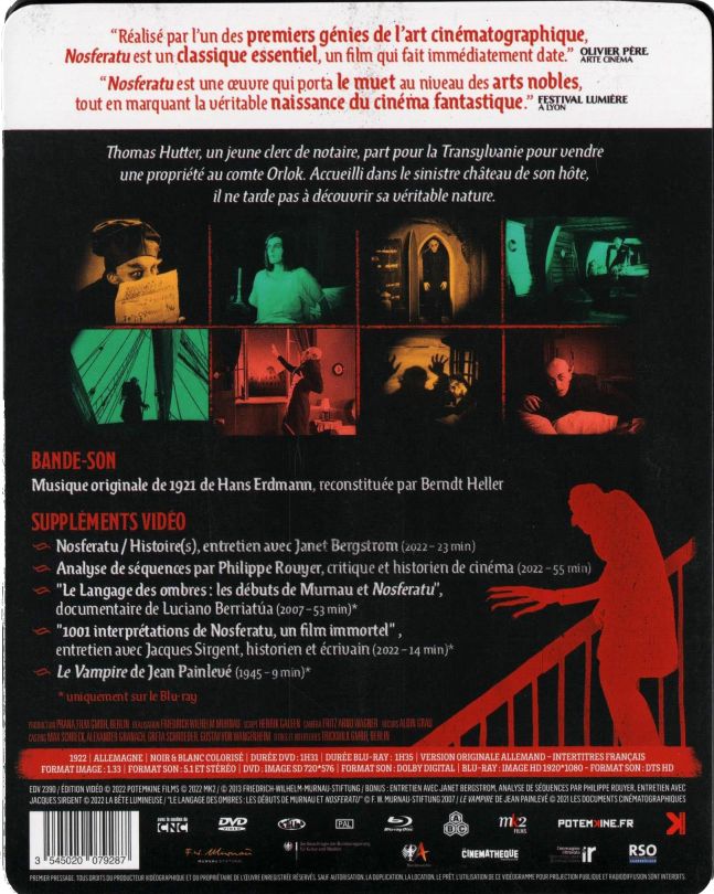 Info beim Starten des Films: NOSFERATU wurde 2005/06 von Luciano Berriatúa für die Friedrich-Wilhelm-Murnau-Stiftung, Wiesbaden restauriert. Grundlage war eine viragierte Nitrokopie der Cinémathéque Française, Paris von 1922 mit französischen Zwischentiteln.