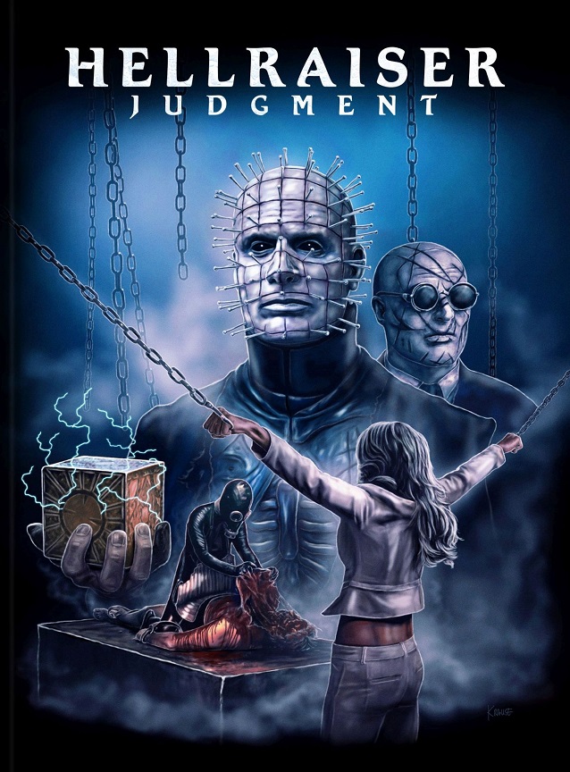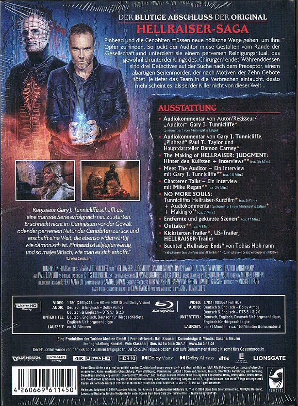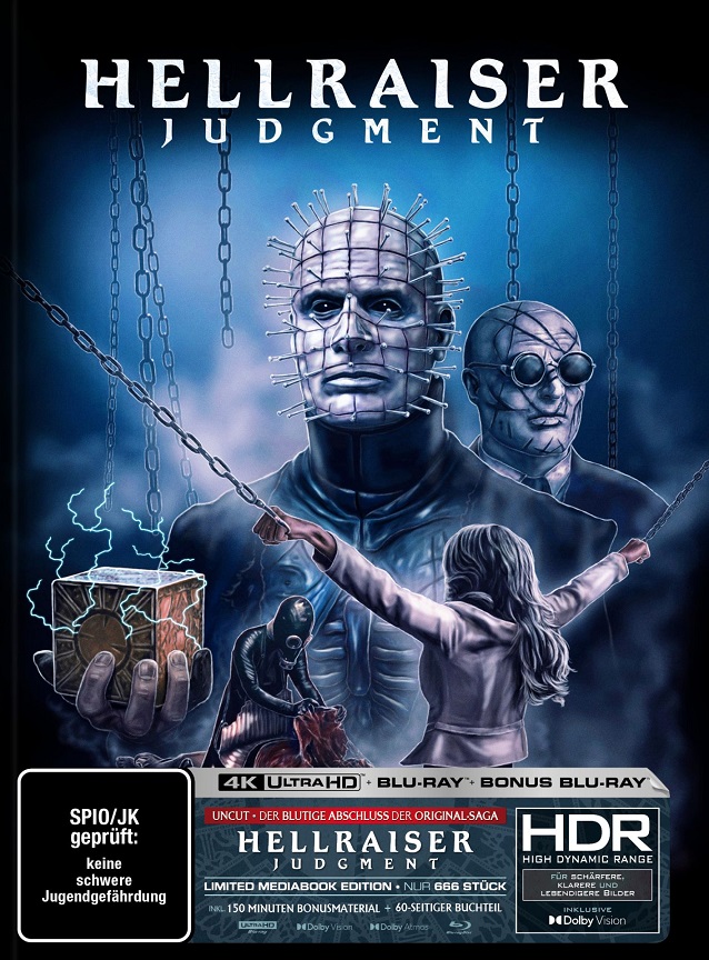 Im Mediabook welches ein gezeichnetes Front-Artwork von Ralf Krause besitzt befinden sich die selben drei Film-Discs (UHD & Blu-ray + Bonus Blu-ray) wie in den Steelbook-Auflagen, sowie ein 60-seitiges Booklet "Hellraiser Ends" mit Text von Tobias Hohmann.