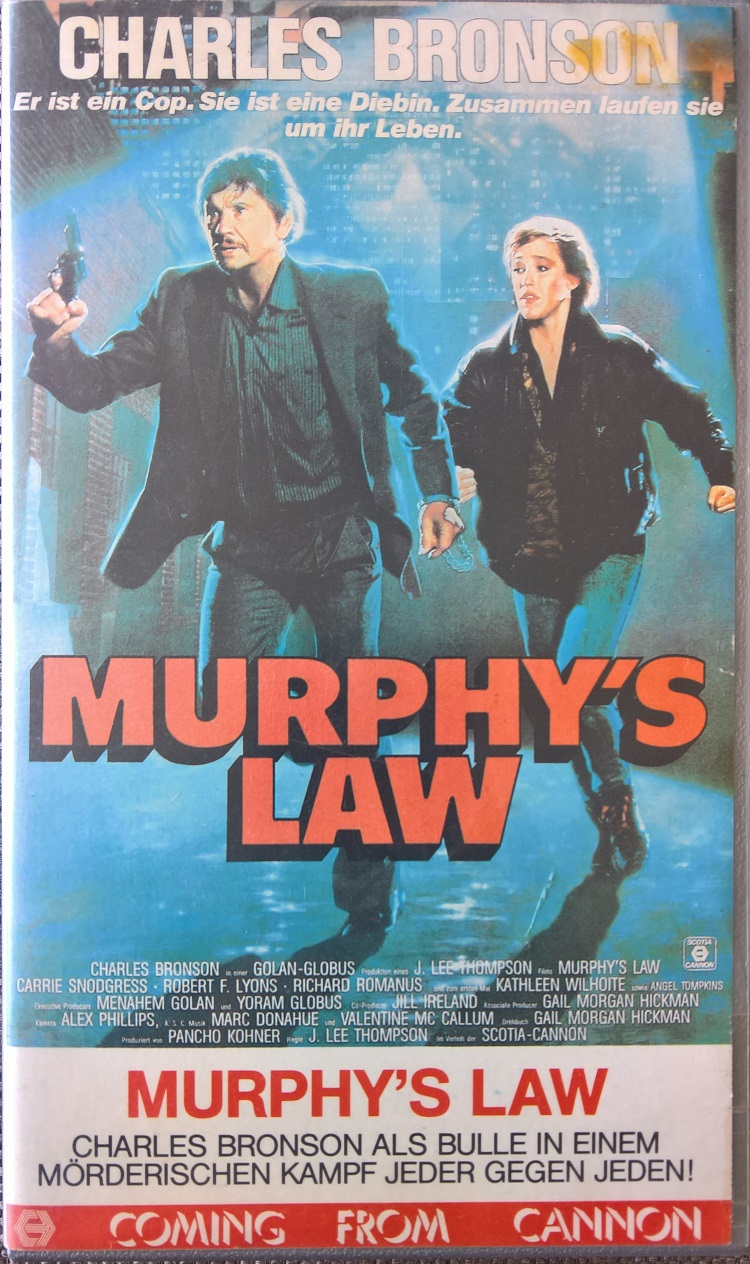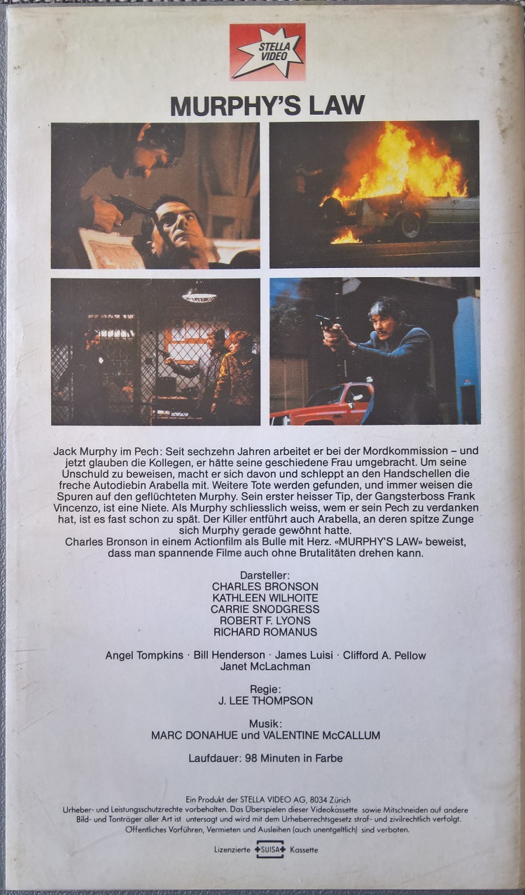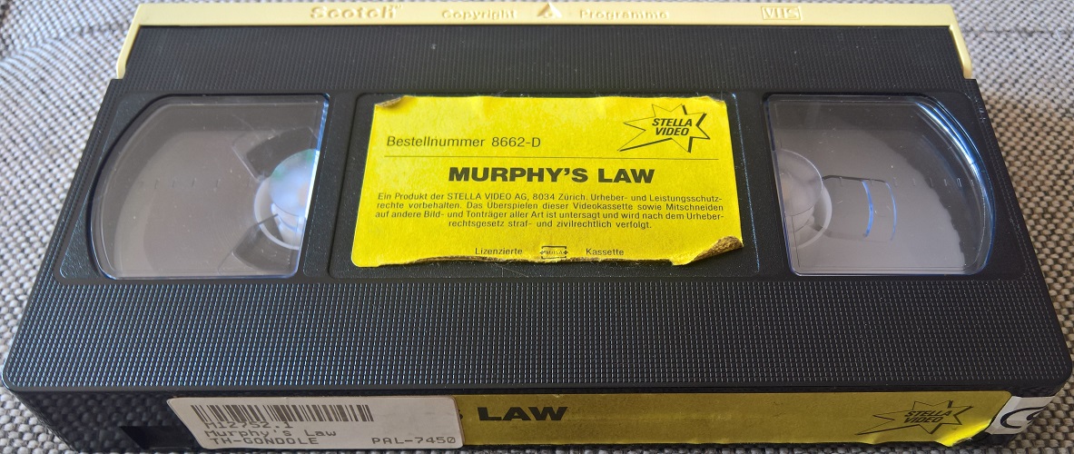 "Murphy's Law" ist auch in der Schweiz auf VHS erschienen. Die Auflage kommt im kleinen Einleger von Stella Video. Der Film ist vollkommen uncut und auch durchgängig deutsch synchronisiert. Das Bild ist etwas dunkel aber ok, der Ton ist gut. Vor dem Film kommen Werbung für Scotch-VHS Kassetten, der Hinweis auf Trailer nach dem Film und das Stella Video-Logo.Im Besitz von 0 Benutzern.