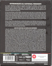 Limited Edition im Hartkartonschuber. Inhaltsangabe, technische Details usw. befinden sich auf einer Pappbanderole. Das Set beinhaltet ein 80 seitiges Booklet mit diversen Essays, ein doppeltseitges Poster und in der Amaray befinden 6 Art Cards, ein Nachdruck von Williams Lee's Visitenkarte sowie von Dr. A. Benway außerdem noch ein Nachdruck des Tickets für die Schiffsreise. Die Amaray bietet außerdem noch ein Wendecover mit dem Original Artwork.Im Besitz von 5 Benutzern.
