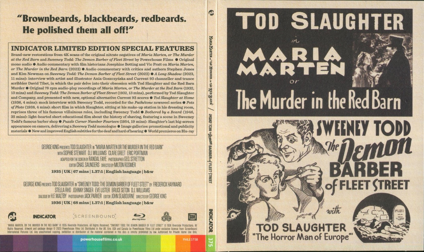 Unlike his contemporaries, such as Boris Karloff and Charles Laughton, Tod Slaughter never left his native shores. Instead, he chose to make his mark in Britain by transferring his most sensational theatrical performances to the screen. Portraying every kind of cruel and cunning criminal – from petty thief to mass murderer – he became the first great villain of British horror, at a time before the Grand Guignol of Hammer Films began to take hold, without once donning monster make-up.