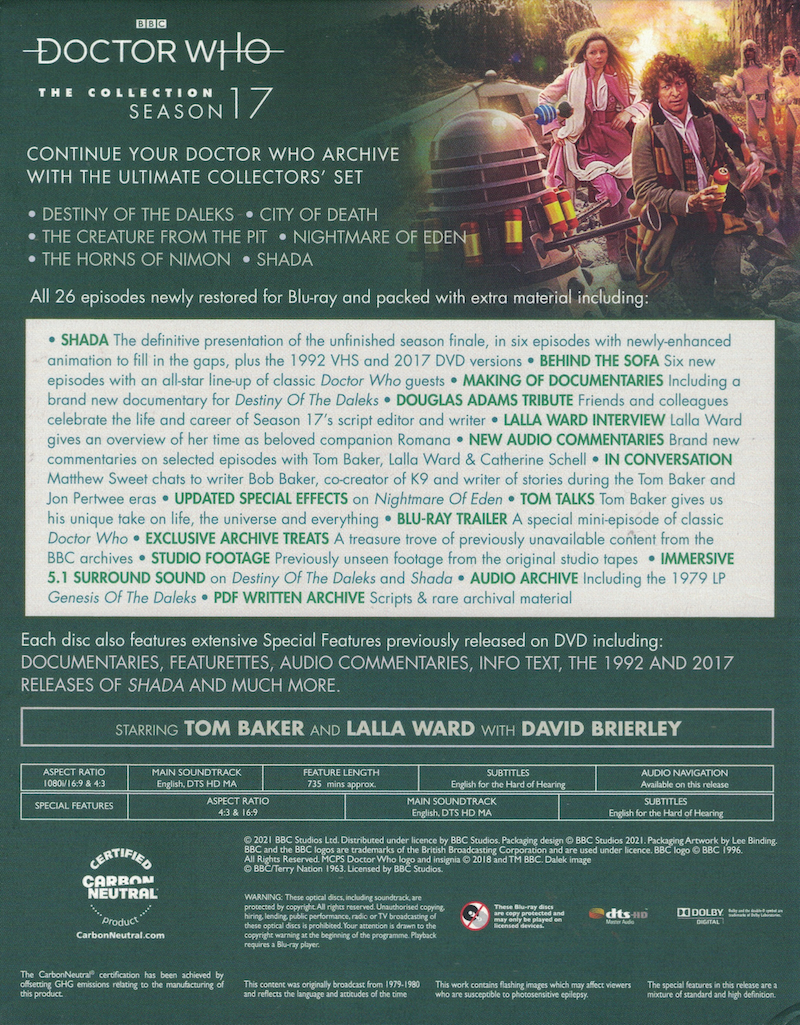 Alle Folgen der Abenteuer der 17. Staffel auf 6 BDs + eine Bonus-BD im dicken Amaray mit zur Seite hin offenem Schuber. Das damals wegen eines Streiks nicht fertiggestellte Serial "Shada" ist in drei später vollendeten Versionen enthalten, mit der neuen "Definitive Version" als Hauptfassung. Es liegt ein 12-seitiges Booklet mit einer Übersicht über die enthaltenen Abenteuer und Extras bei.