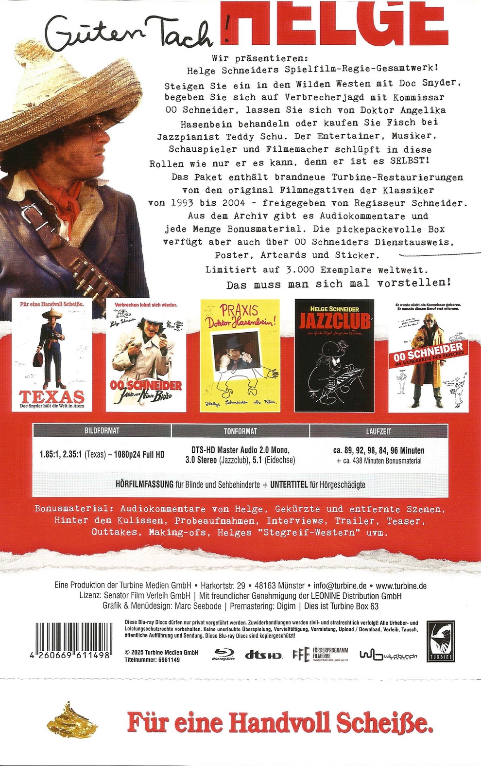 Die auf 3000 limitierte 5 Disc Capbox von Turbine enthält folgende Filme von und mit Helge Schneider und ist Rakete-Shop exklusiv: