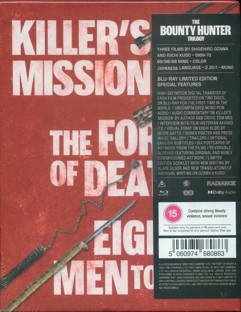 Before he made his name in Lone Wolf and Cub Tomisaburo Wakayama starred in this triptych of violent samurai spectacles that draw on James Bond and Spaghetti Westerns for inspiration yet feature the familiar style and blood-spattering action of the period. Wakayama stars as Doctor and spy-for-hire Shikoro Ichibei who in Shigehiro (The Streetfighter) Ozawa's Killer's Mission is hired to prevent the sale of firearms to a hostile Shogun. In Eiichi (13 Assassins) Kudo's follow-up, The Fort of Death, Ichibei is hired on a Seven Samurai-style mission to protect a village of farmers from a ruthless Lord. The final film sees Ozawa return for Eight Men to Kill, in which Ichibei is hired to recover a cache of stolen gold from the government's mine. Featuring an array of weapons and gadgets that would make Q proud with Ichibei supported by a band of helpers including fellow spies, ronin and female ninjas, the Bounty Hunter films deliver action thrills galore and deserve to sit alongside the celebrated action epics that followed.