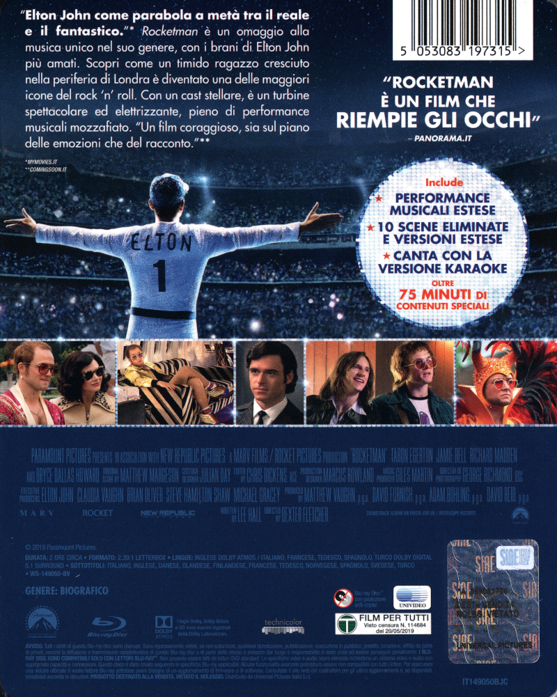 [nur Englisch (Dolby Atmos / TrueHD 7.1) mit optionalen englischen, einfärbenden Karaoke-UT] Film mit Mitsing-Songs abspielen [Kompletter Film nur auf Englisch (Dolby Atmos / TrueHD 7.1) mit optionalen englischen, einfärbenden Karaoke-UT während der Songs] Alle Mitsing-Songs wiedergeben (35:44 Min.) The Bitch Is Back (1:53 Min.) I Want Love (2:08 Min.) Saturday Night's Alright (For Fighting) (3:17 Min.) Your Song (3:24 Min.) Crocodile Rock (3:09 Min.) Tiny Dancer (2:46 Min.) Honky Cat (2:17 Min.) Rocket Man (4:26 Min.) Bennie and the Jets (2:33 Min.) Don't Let the Sun Go Down on Me (2:44 Min.) Sorry Seems to Be the Hardest Word (1:31 Min.) Goodbye Yellow Brick Road (1:58 Min.) I'm Still Standing (3:35)