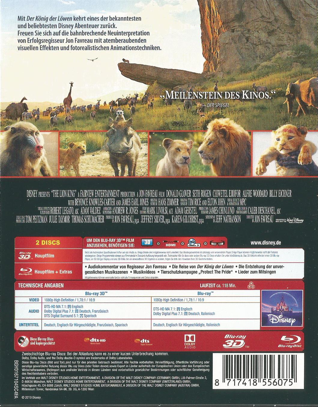 Französisch und Spanisch sind nur bei der 3D-Fassung, Italienisch nur bei der 2D-Fassung enthalten. Der Audiokommentar ist ebenfalls nur für die 2D-Variante verfügbar, dafür verfügt die 3D-Fassung über die englische Audiodeskription für Sehbehinderte.