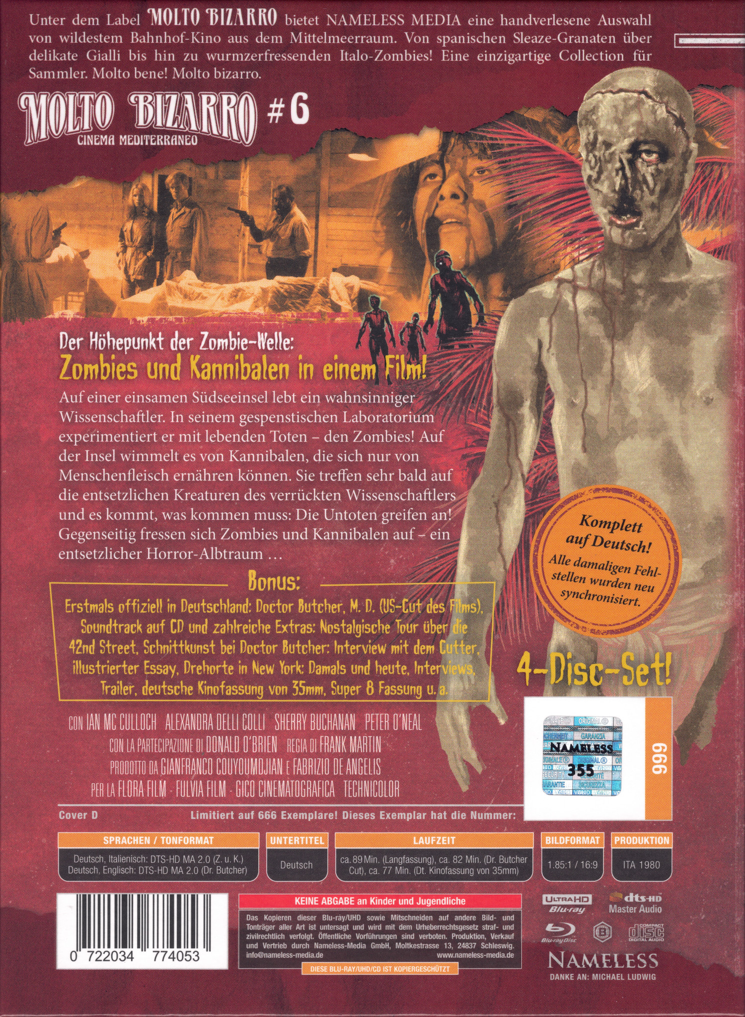 Auf 666 Exemplare limitiertes und per Hologrammsticker durchnummeriertes Mediabook mit dem Covermotiv D (Molto Bizarro #6*), welches den Film auf UHD und Blu-ray, eine BD mit Bonusmaterial sowie den Filmsoundtrack** auf CD enthält. Da diese Veröffentlichung ungeprüft ist, gab es keinerlei FSK-Logos oder ähnliches auf der Vorderseite. Die rückseitigen Informationen (EAN, technische Daten, Inhaltsangabe und Limitierungsnummer) sind aufgedruckt. Die Langfassung erscheint bei dieser 4K-Premiere erstmalig komplett deutsch synchronisiert.