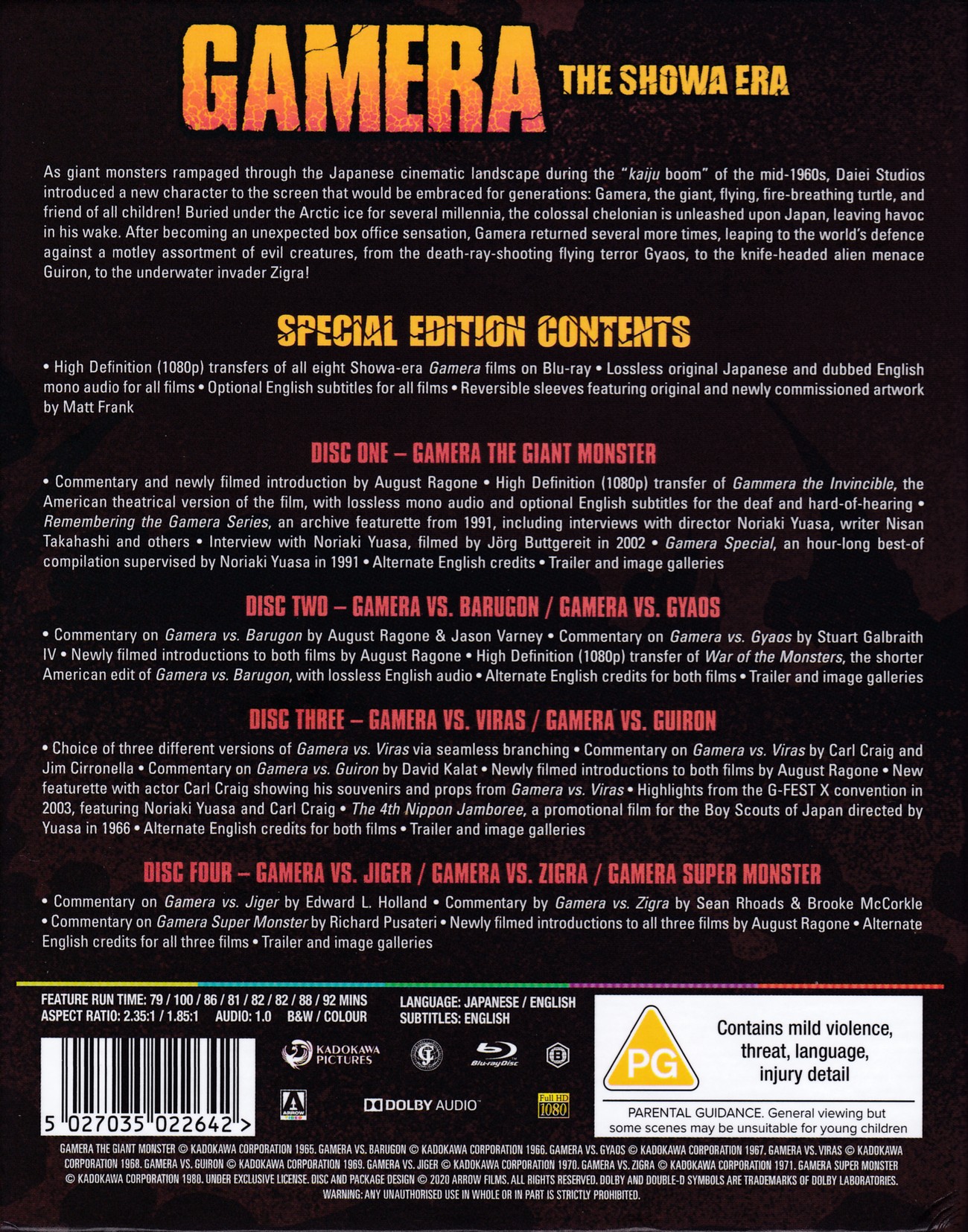 Alle acht Gamera-Filme der Showa-Ära auf ingesamt vier Discs. Jede Disc befindet sich in einem Keep Case mit Wendecover (Artwork/Plakat-Motiv). Die vier Keep Cases stecken wiederum in einem großen Schuber.