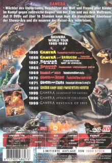 Enthält 11 Gamera Filme und einen Platzhalter für Gamera – The Brave (hätte Anfang 2016 erscheinen sollen). Die Box ist laut Cover auf 1000 Stück limitiert, aber keine NummerierungIm Besitz von 18 Benutzern.