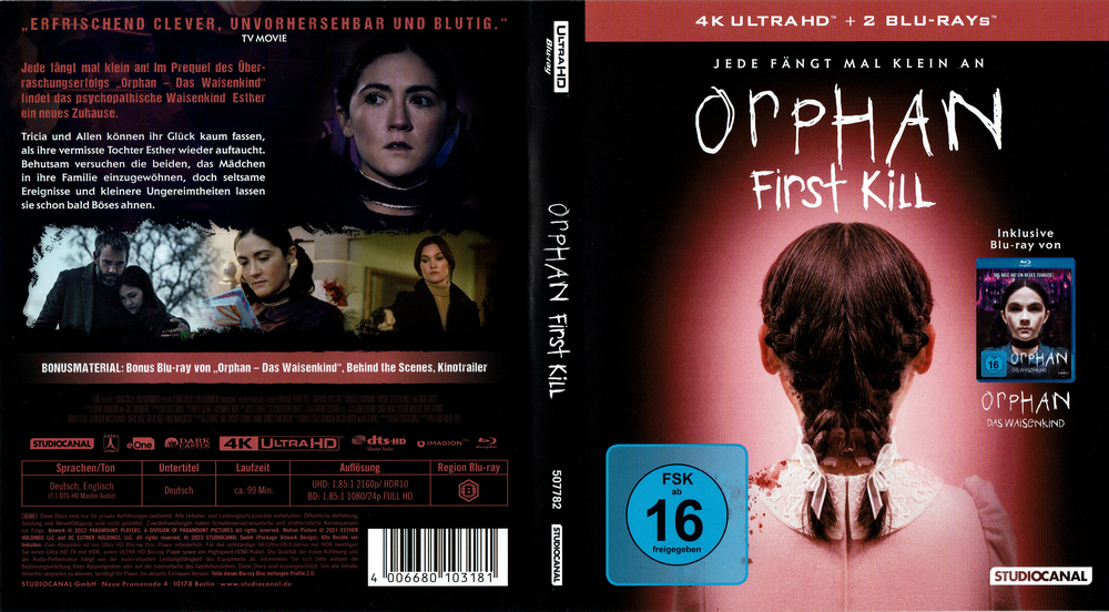 "Orphan - First Kill" befindet sich in dieser Veröffentlichung sowohl auf 4K UHD Blu-ray als auch auf Blu-ray Disc. Zusätzlich befindet sich als Bonus eine weitere Blu-ray Disc im Keep Case mit "Orphan - Das Waisenkind". Mit Wendecover.