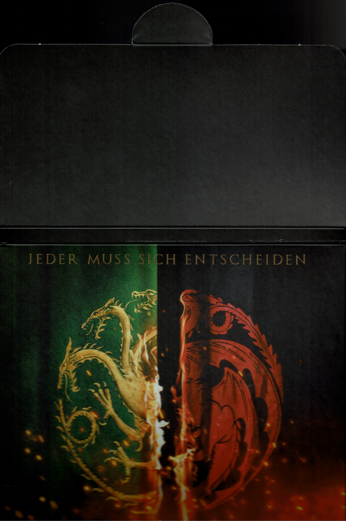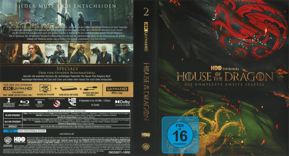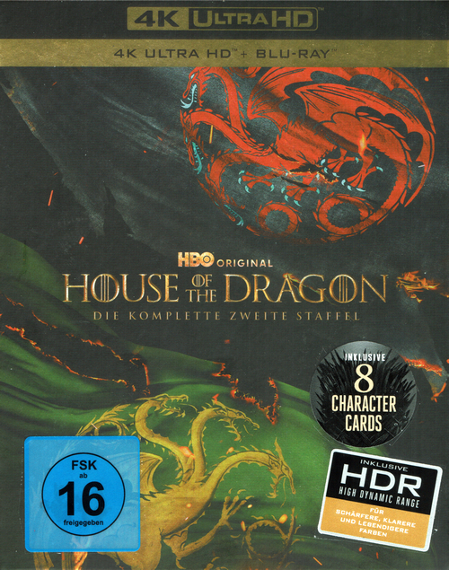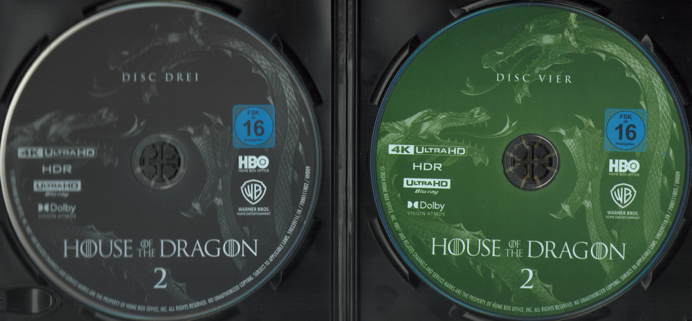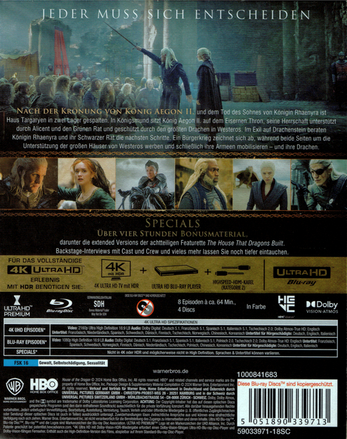 8 Disc-Set mit vier 4K Ultra HD Blu-rays und vier Blu-ray Discs in einem dicken Keep Case. Die Hülle steckt in einem stabilen Schuber, in dem sich auch noch ein Pappkuvert befindet, welches ein vierseitiges Episodenheftchen und acht Charakterkarten enthält. Die FSK-Freigabe und Werbung auf dem Schuber ist bloß aufgeklebt, das Keep Case dagegen hat eine fest aufgedruckte Freigabe und kein Wendecover.
