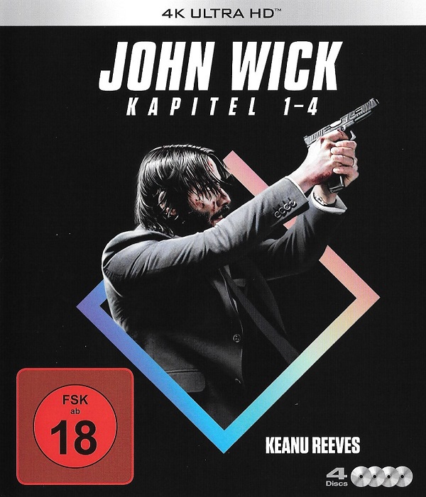 Die 4 Filme der John Wick-Reihe jeweils auf Ultra HD Blu-ray gemeinsam in einer Amaray; bei den Discs handelt es sich um Repacks der Ultra HD Blu-rays aus den jeweiligen Einzelveröffentlichungen (siehe unterschiedliche Label-Logos auf den einzelnen Discs)